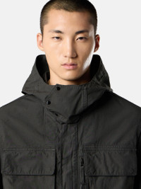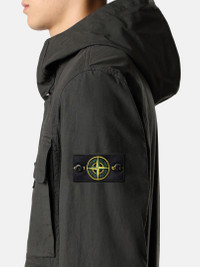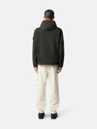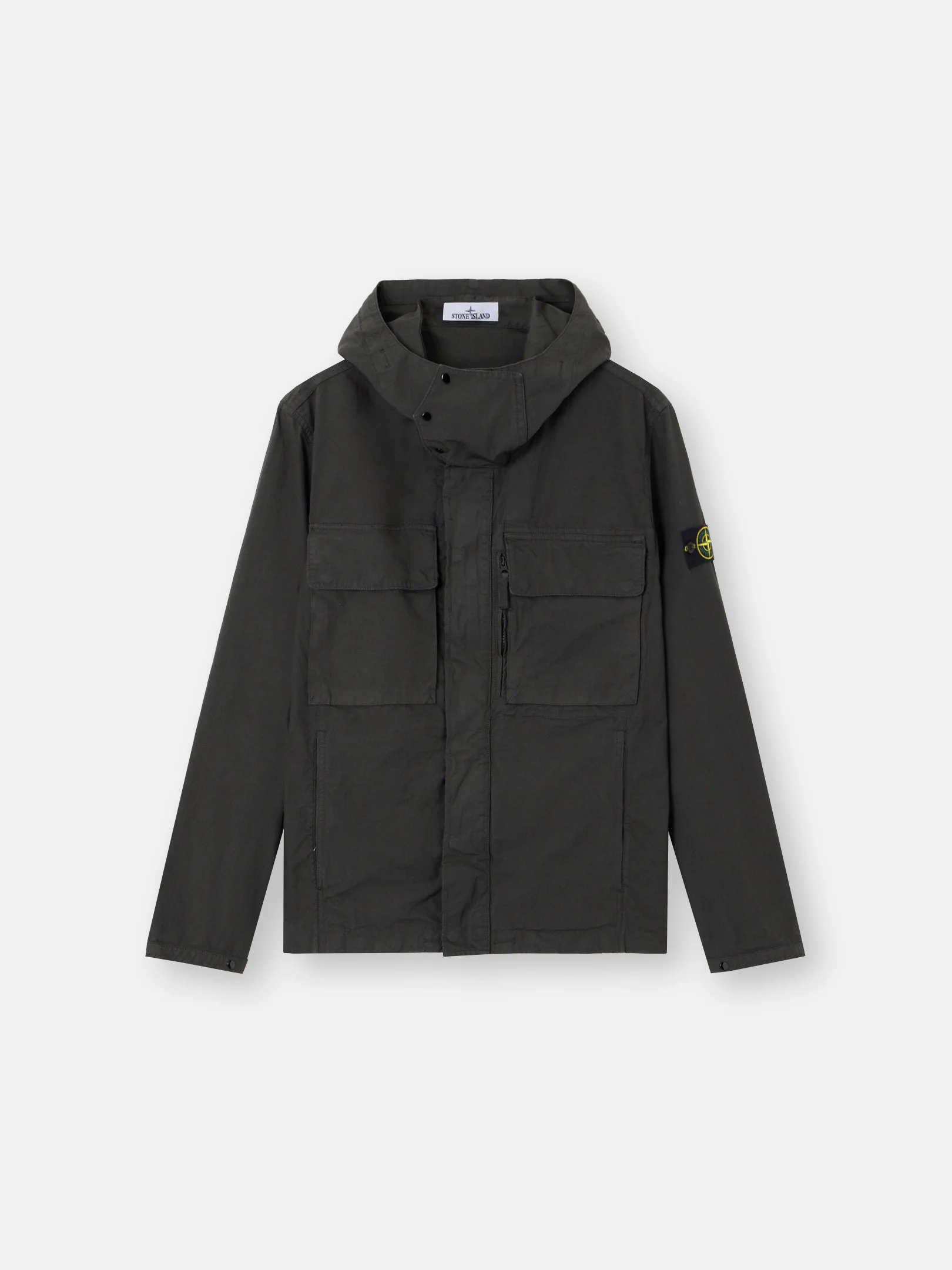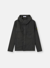 Hooded field jacket in canvas weave cotton, featuring bellows chest pockets, a standing zipper pocket, and hidden two-way zipper fastening. Garment dyed with anti-drop. FABRIC RESEARCH AND TREATMENT Hooded field jacket in canvas weave cotton. The garment dyeing procedure with specific recipes and the addition of an anti-drop agent lends a unique appearance to the piece. STYLE AND FIT Fixed tape drawstring in hood. Triangular chin flap with three snaps. Two chest bellows pockets with three snaps hidden under flap; left pocket overlaps with second standing zipper pocket. Two inner pockets. Standing hand pockets. Eyelets under armholes. Stone Island badge on left sleeve. Tightening snaps at cuffs. Inner fixed tape drawstring in bottom hem. Hidden two-way zipper fastening under snap placket. COMPOSITION AND CARE 100% Cotton