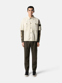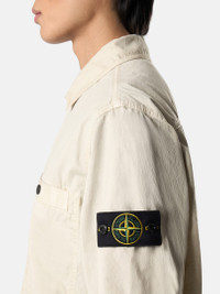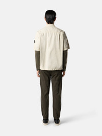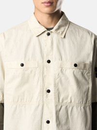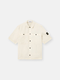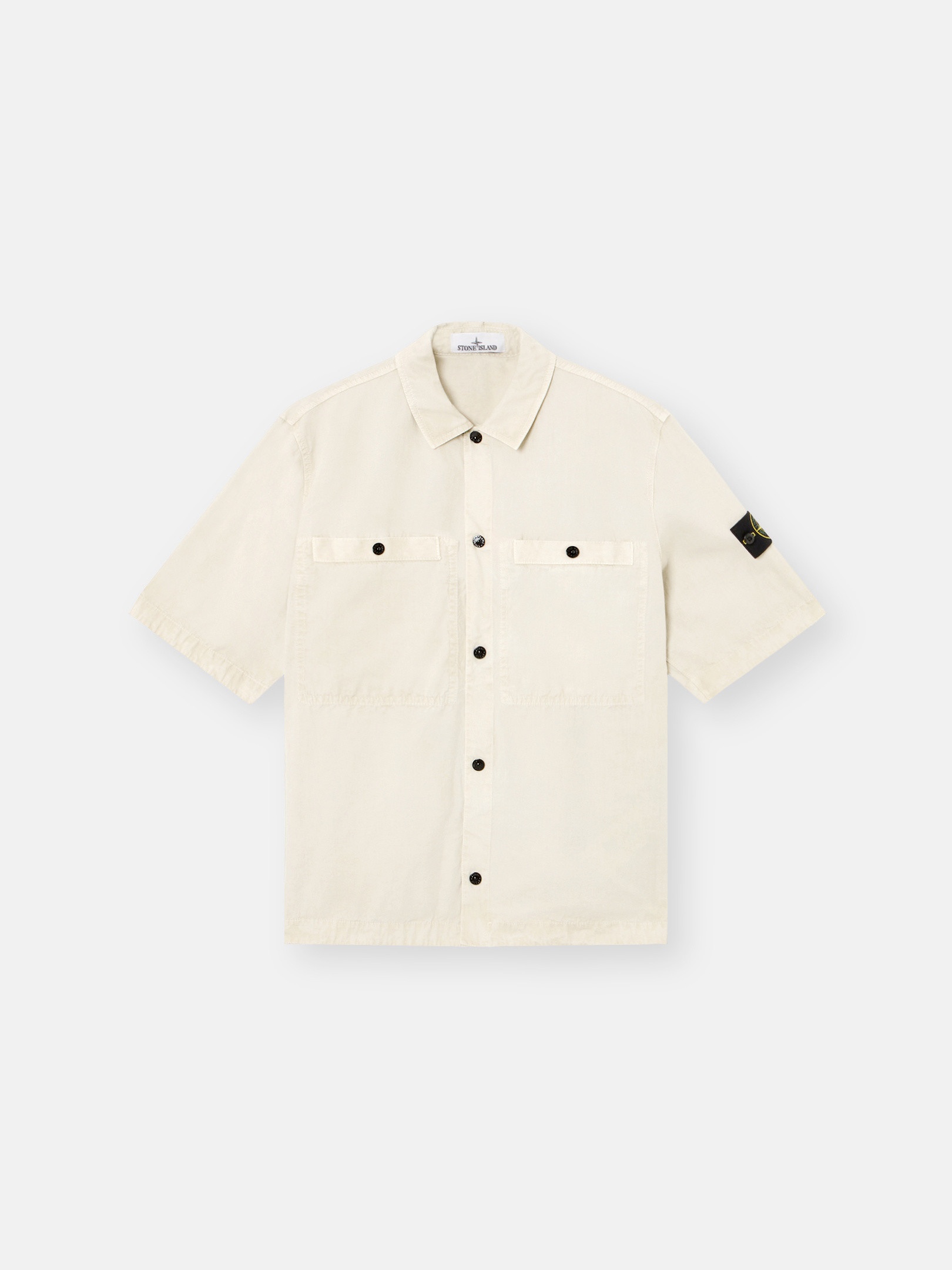 Short-sleeve shirt made from brushed organic cotton canvas with a slightly worn appearance, featuring chest pockets, and snap fastening. Garment dyed. FABRIC RESEARCH AND TREATMENT Short-sleeve shirt in brushed organic cotton canvas. Garment dyed with the 'OLD' treatment, an exclusive dyeing treatment and subsequent fading on the finished garment for a slightly worn and three-dimensional appearance. STYLE AND FIT Two chest pockets with top entrance and snap fastening on cotton tape. Stone Island badge on the left sleeve. Yoke on back. Snap fastening. Comfort fit. COMPOSITION AND CARE 100% Cotton