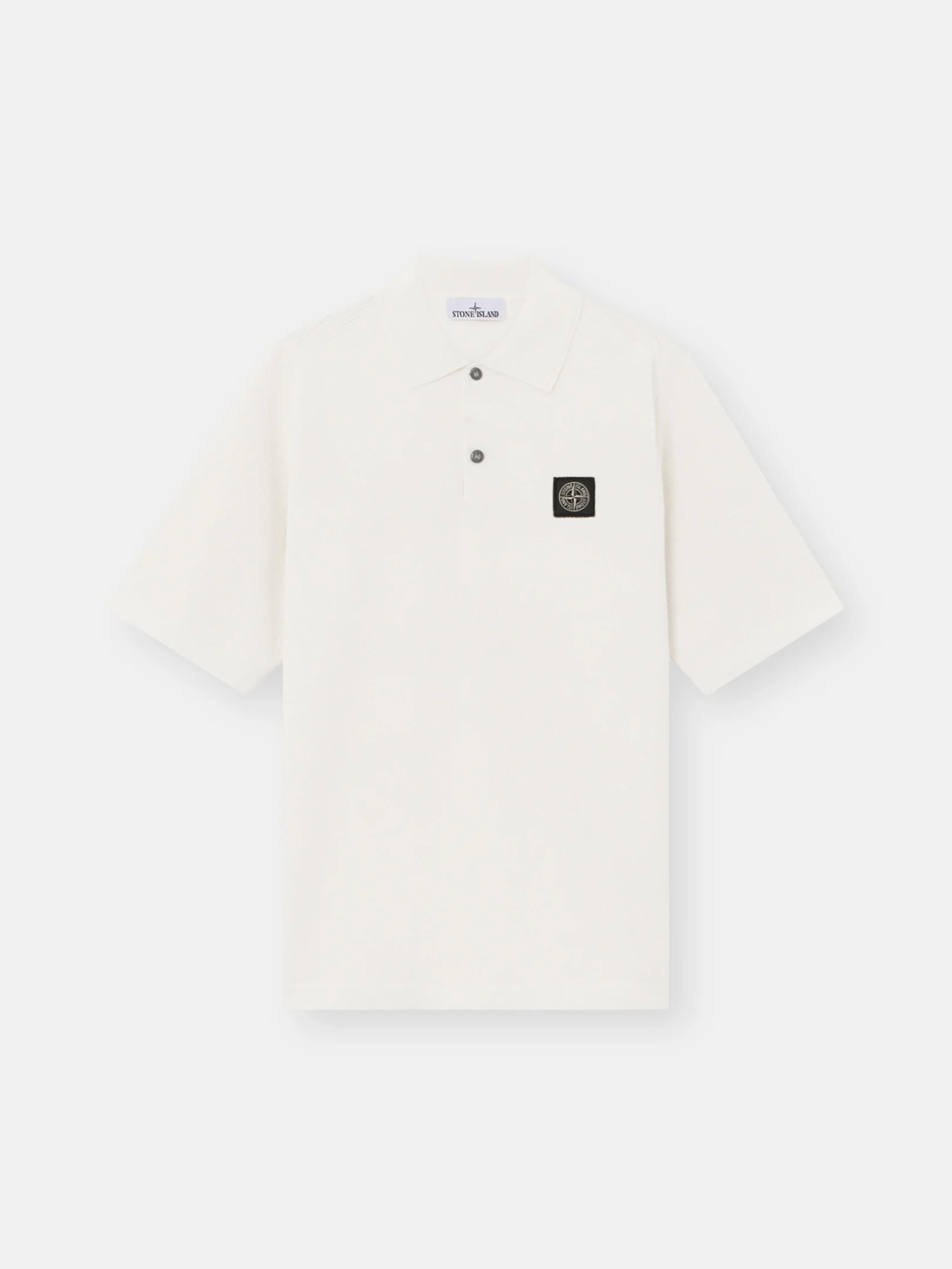 Knit short-sleeve polo in micro stitch soft organic cotton, featuring a ribbed collar with two-button fastening, Compass patch, and contrast-knit ribbed panels. Gauge 14. FABRIC RESEARCH AND TREATMENT Knit short-sleeve polo in micro stitch soft organic cotton. Gauge 14. STYLE AND FIT Ribbed collar with raised ridge detail and two-button fastening. Raglan sleeves with ribbed band. Compass logo patch on chest. Contrast-knit ribbed panels on shoulders and sleeves. Ribbed cuffs and hem. Loose fit. COMPOSITION AND CARE 100% Cotton
