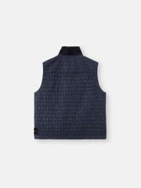 Quilted vest in light nylon rep whose inner resin coating makes the garment wind resistant with a crinkled appearance, featuring a ribbed bomber collar and pockets. Garment dyed with anti-drop. FABRIC RESEARCH AND TREATMENT Padded vest in a light nylon rep with an ultra-tight weaving construction. The fabric features multiaxial quilting and an internal padding layer. The resin coating of its inner face makes it wind resistant and mildly water resistant. Due to the uneven penetration of color into the resin-coated fabric, the dye bath lends a crinkled appearance to the surface. The addition of a special agent to the dye formula makes the piece anti-drop. STYLE AND FIT Ribbed knit bomber collar. Large hand pockets with diagonal tape trim and snap. Back yoke. Stone Island badge on bottom left side. Snap fastening. COMPOSITION AND CARE Garment: 100% Polyamide / Nylon. Coating: 100% Polyurethanic Resin. Lining: 100% Polyamide / Nylon. Padding: 100% Polyester. Collar: 48% Virgin Wool 43% Cotton 8% Polyamide / Nylon 1% Elastane / Spandex
