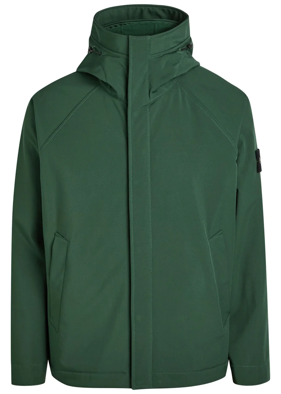 Info & Care Stone Island soft shell_e.dye jacket Water resistant, Drawstring hood, high-neck, raglan sleeves, detachable designer plaque at sleeves, adjustable press-stud fastening at cuffs, press-stud fastening side slip pockets, concealed drawstring at adjustable hem, two internal patch pockets, fleece lining Concealed press-studs and two way zip fastening at front; 92% polyester, 8% elastane Machine wash; Size & Fit Length shoulder to hem: 27 inches/ 68.5cm; Midweight; Regular fit; Model is 6'2"/ 188cm, chest size 35 inches and wears a size medium;