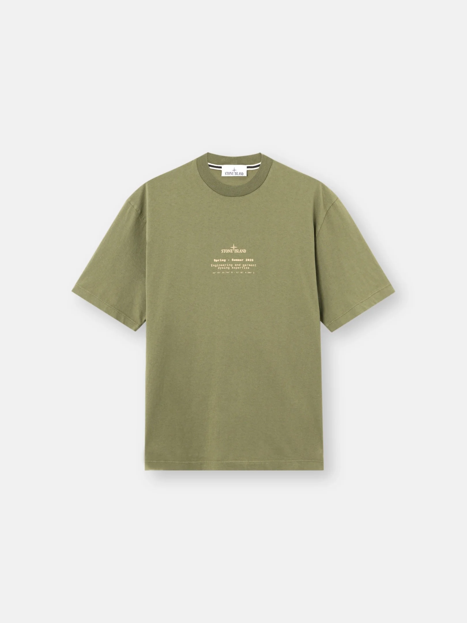 Short-sleeve T-shirt in organic cotton jersey, featuring a logo and text print on the chest and a large Compass motif with aged effect on the back. Garment dyed. FABRIC RESEARCH AND TREATMENT Short-sleeve T-shirt in organic cotton jersey with “Stone” print. Garment dyed. STYLE AND FIT Ribbed neckline. Print on chest with Stone Island logo and text. Large Compass logo print with aged effect and text on back. COMPOSITION AND CARE Garment: 100% Cotton Ribbing: 100% Cotton