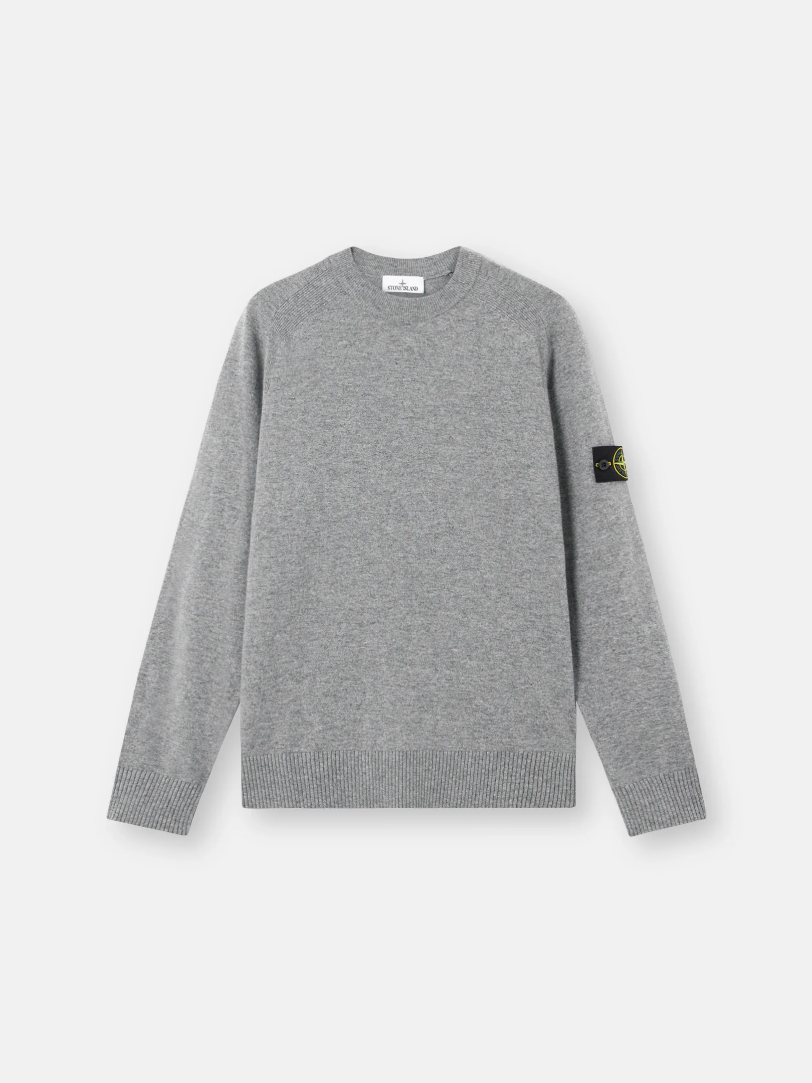 Knit crewneck sweater in light RWS Geelong wool featuring ribbed bands on raglan sleeves, and ribbed cuffs and bottom band. Gauge 12. FABRIC RESEARCH AND TREATMENT Knit crewneck sweater in light RWS Geelong wool. Stockinette stitch. Gauge 12. STYLE AND FIT Ribbed neckline. Raglan sleeves with ribbed bands. Stone Island badge on left sleeve. Ribbed cuffs and bottom band. Loose fit. COMPOSITION AND CARE 100% Virgin Wool