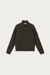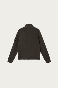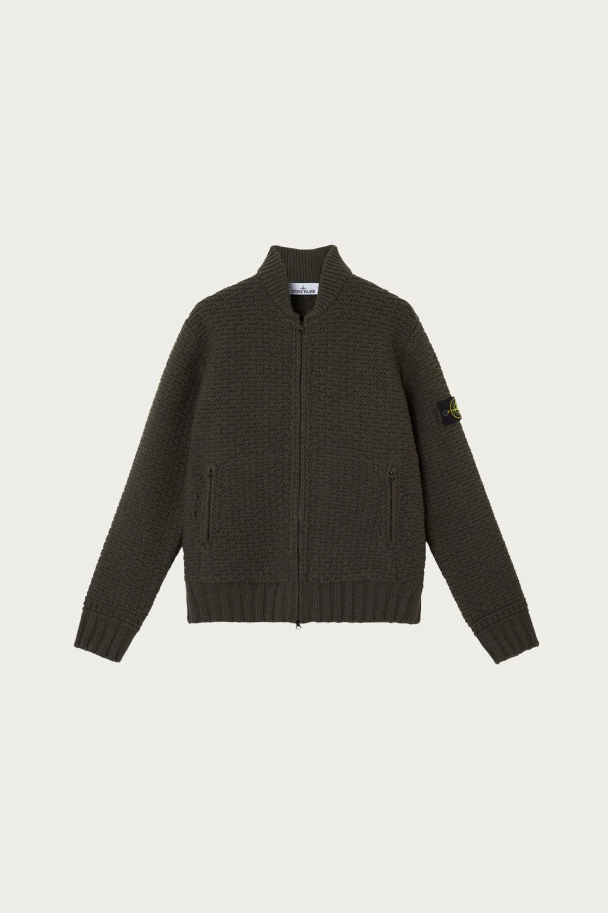 Blending knitwear ease and bomber structure, this Stone Island zip jumper feels like a soft shell in wool form. Crafted in 100% pure wool and built with mixed stitches for texture, it features slanted zip hand pockets and a hidden two-way center-front zip that keeps the lines clean. Ribbed bomber collar, cuffs, and bottom band anchor the shape, giving it a grounded presence. The Stone Island badge on the sleeve adds the brand signature without shouting it. - 100 % pure wool knit - Slanted zip hand pockets - Hidden two-way zip closure - Stone Island badge on left sleeve - Made in Italy