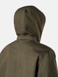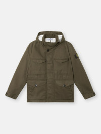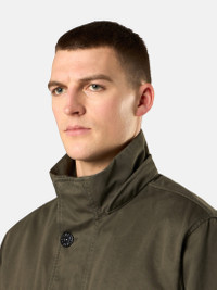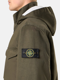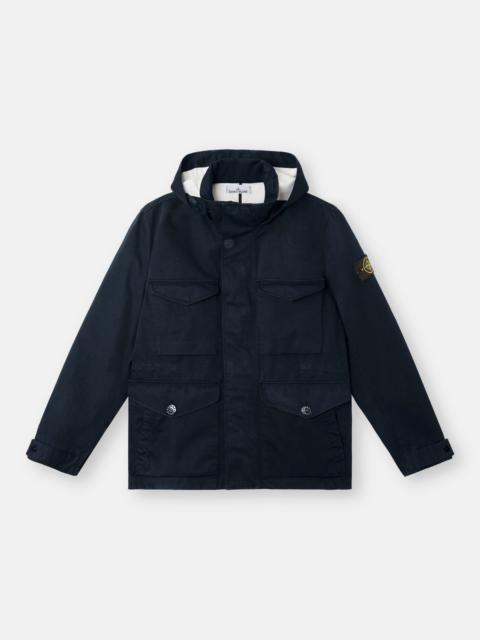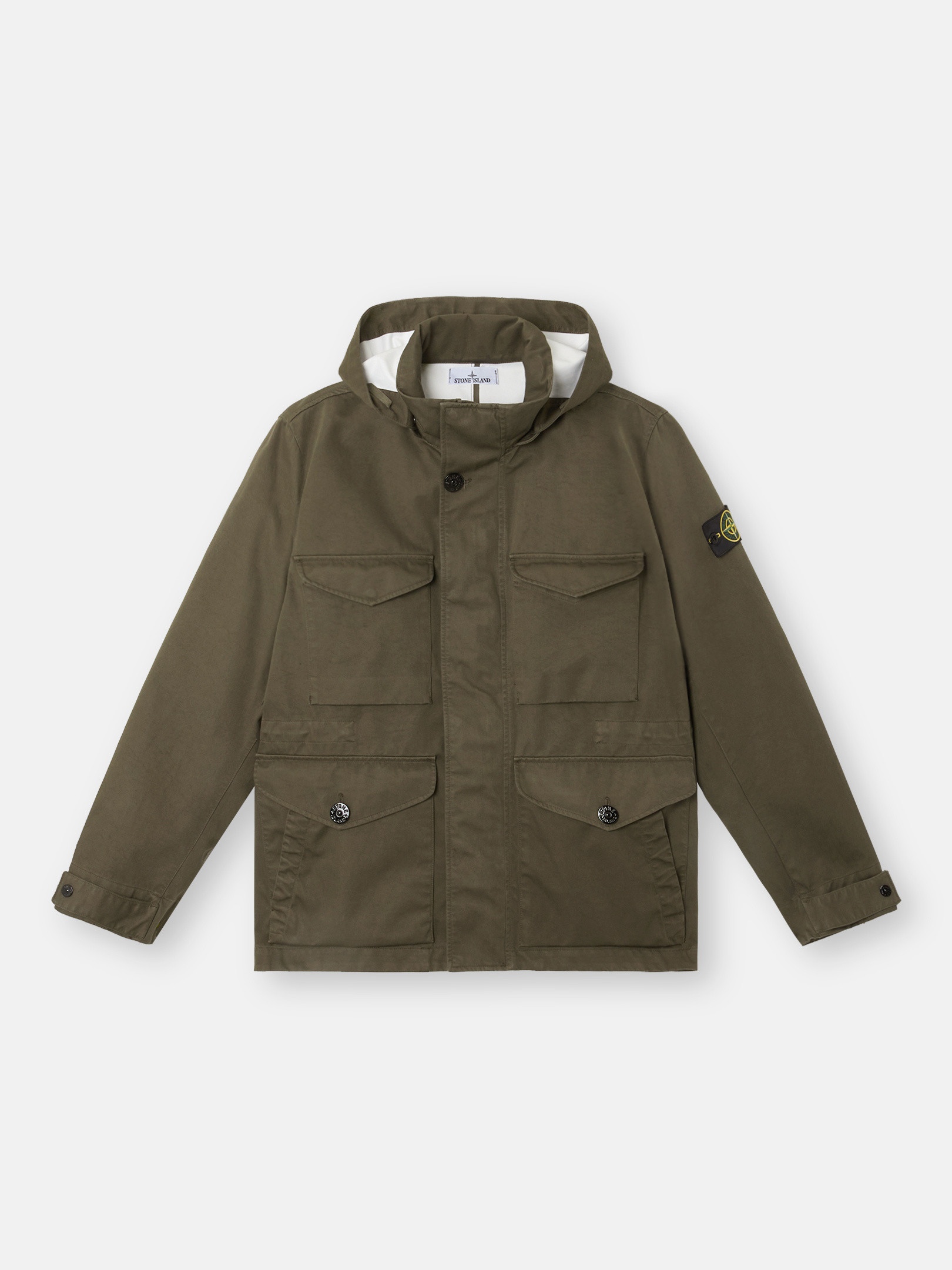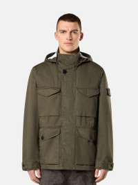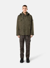 Field jacket in a three-layer performance fabric composed of a cotton satin bonded to a breathable, waterproof and windproof membrane, protected with a polyester mesh. Garment dyed. FABRIC RESEARCH AND TREATMENT Field jacket in Raso Gommato 3L. An evolution of the iconic Stone Island Raso Gommato fabric, this performance version is made from a military-specification cotton satin bonded to a breathable, waterproof and windproof membrane, protected with a polyester mesh. Garment dyed using specific recipes with the addition of a special anti-drop agent. STYLE AND FIT Detachable hood with contour drawstring. Standing collar. Bellows chest pockets with flap and hidden snap fastening. Double hand pockets, one with flap and button fastening and second slanted pocket on top. Inner drawstring at waist. Stone Island badge on the left sleeve. Adjustable strap at cuffs held by snap. Hidden two-way zipper and snap fastening. COMPOSITION AND CARE Outer Layer: 100% Cotton. Membrane: 100% Polyurethane. Inner Layer: 100% Polyester