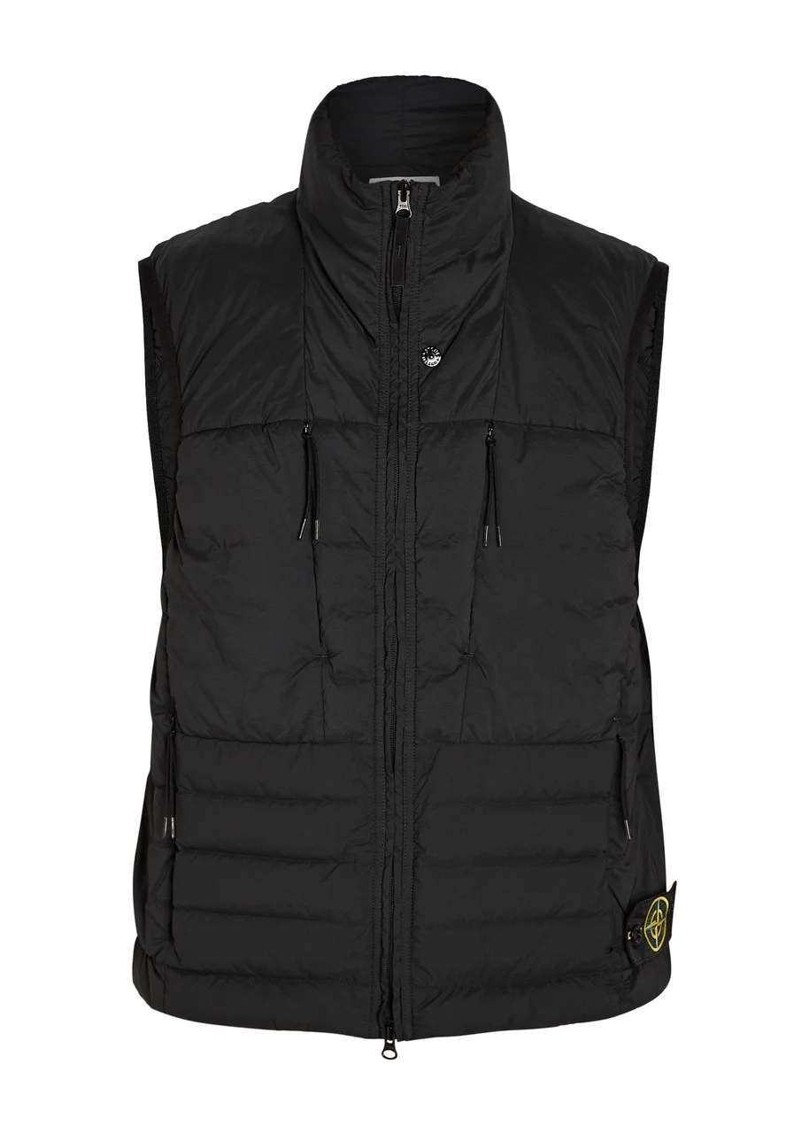 Info & Care Stone Island shell gilet Padded, high-neck, two chest zip-fastening pockets, zip-fastening side pockets, detachable designer applique at hem, concealed toggle-fastening hem, fully lined Push-stud and two-way zip fastening through front 86% polyamide, 14% elastane; fill: 90% duck down, 10% feather Machine wash Size & Fit Length shoulder to hem: 25 inches/ 63.5cm Midweight Regular fit Model is 6'2"/ 188cm, chest size 38 inches and wears a size medium