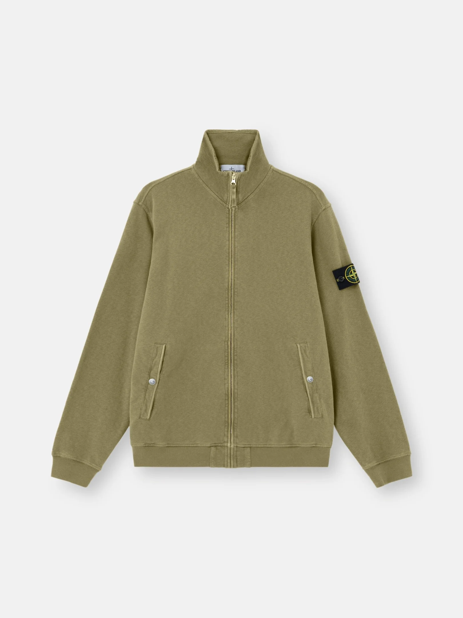Zipper-up track jacket in malfile cotton fleece with slub effect, featuring hand pockets, ribbed trims, and concealed zipper fastening. Lightweight. Garment dyed with the “OLD” treatment for a slightly worn appearance. FABRIC RESEARCH AND TREATMENT Zipper-up track jacket in malfile cotton fleece with slub effect. Lightweight. Garment dyed with the “OLD” treatment, an exclusive dyeing treatment and subsequent fading on the finished garment for a slightly worn and three-dimensional appearance. STYLE AND FIT Stand collar. Angled hand pockets with fixed flap and snap, and internal tape reinforcement. Internal top-entry pockets. Stone Island badge on left sleeve. Ribbed cuffs and bottom band. Concealed zipper fastening. Regular fit. COMPOSITION AND CARE External Fabric: 100% Cotton Ribbing: 100% Cotton