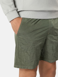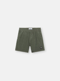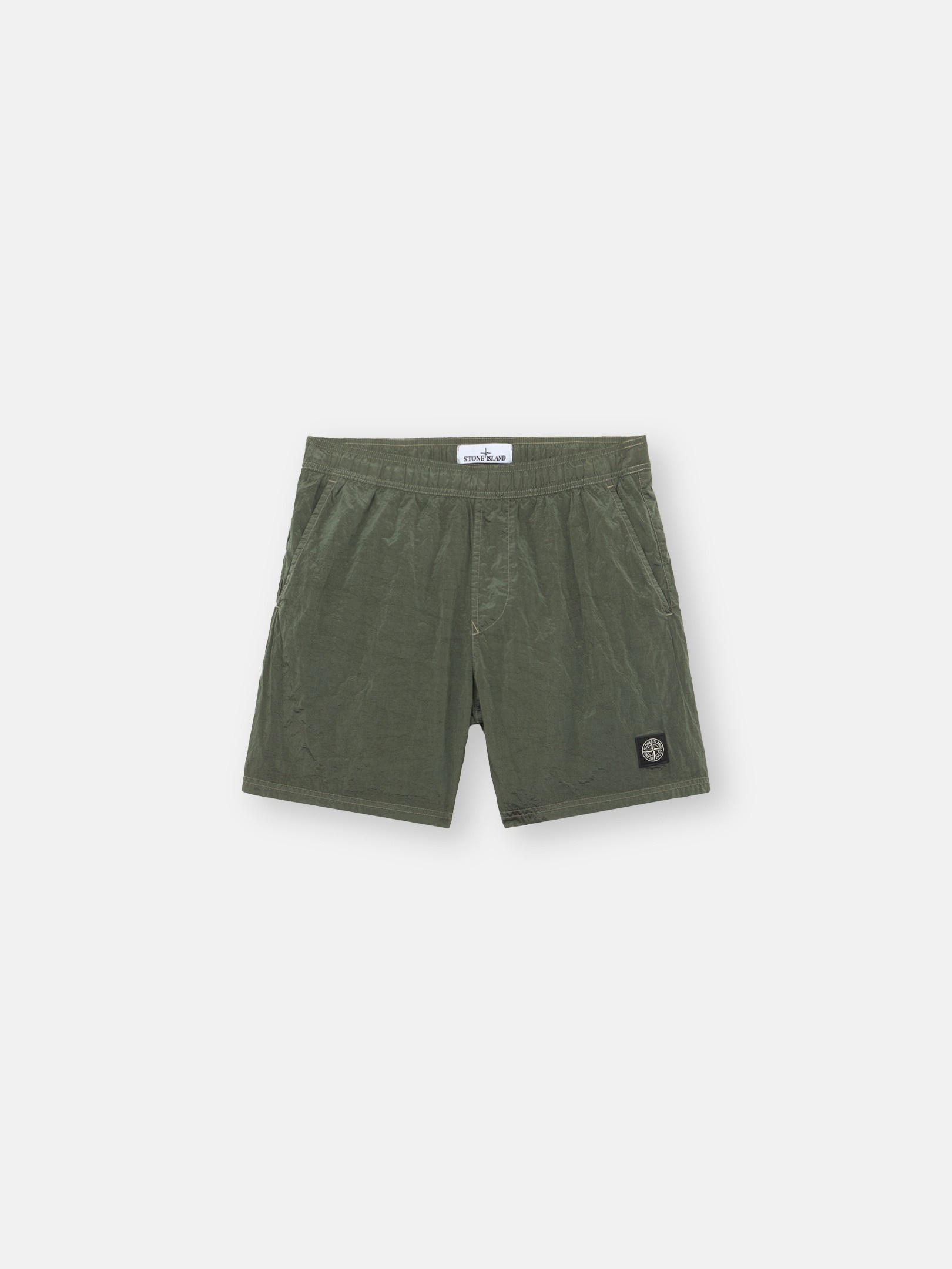 Swim trunks made from Nylon Metal with ECONYL® regenerated yarns that have undergone an elaborate double dye procedure, featuring pockets and inner mesh. FABRIC RESEARCH AND TREATMENT Swim trunks made of a new responsible Stone Island iridescent Nylon Metal fabric. The evolution of this iconic fabric sees the use of ECONYL® regenerated yarns: pre- and post-consumer end-of-life nylon is recycled with a complex depolymerization process to create this fiber that features the same intrinsic characteristics of nylon from raw fossil materials. The finished piece then undergoes an elaborate double dye procedure. STYLE AND FIT Slanted hand pockets. One back pocket with hidden zipper closure. Stone Island Compass logo patch on the left leg. Inner mesh. Elasticized waistband with inner drawstring. Regular fit. COMPOSITION AND CARE External Fabric: 100% Polyamide / Nylon. Lining: 100% Polyamide / Nylon