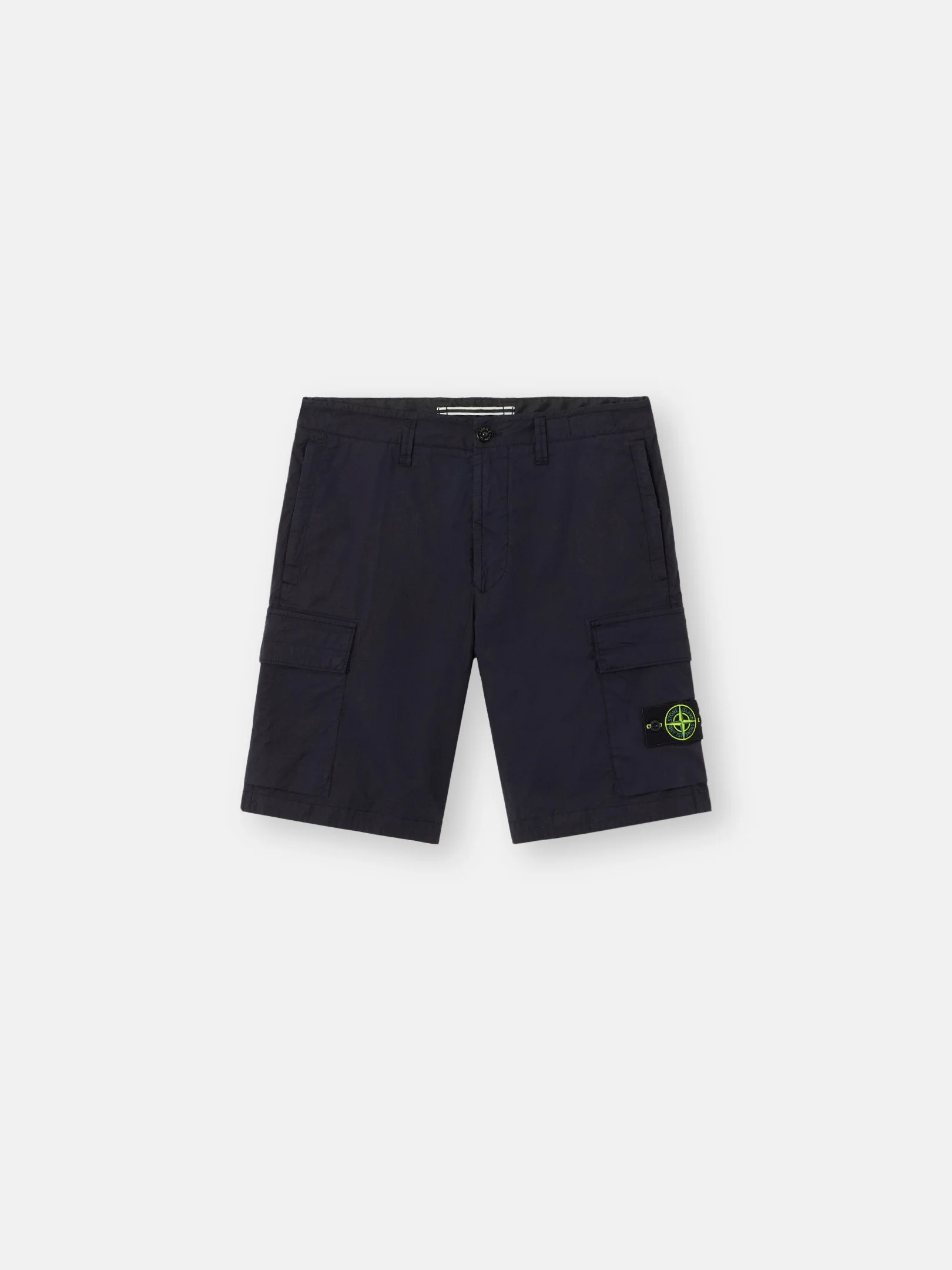 Bermuda shorts made from a light stretch cotton tela featuring zipper hand pockets, one back pocket, and snap pockets on the legs. Garment dyed. FABRIC RESEARCH AND TREATMENT Cargo Bermuda shorts in light stretch cotton tela. Garment dyed. STYLE AND FIT Standing hand pockets with hidden zipper fastening. One back slit pocket with hidden snap fastening. Bellows pockets on legs with flap and hidden snap fastening; the left pocket features the Stone Island badge. Zipper and button fly. Regular fit. COMPOSITION AND CARE External Fabric: 97% Cotton 3% Elastane / Spandex. Pocket Bag: 100% Cotton