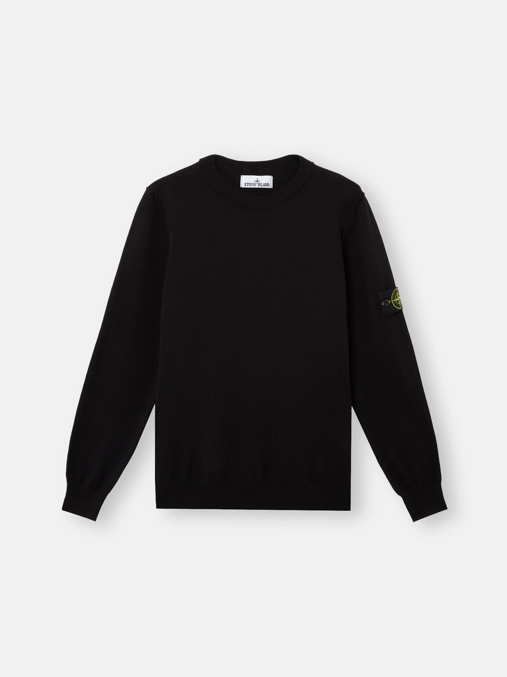 Knit crewneck sweater made from soft organic cotton with stockinette stitch, featuring small roll details and ribbing. Gauge 14. FABRIC RESEARCH AND TREATMENT Knit crewneck sweater in soft organic cotton. Stockinette stitch. Gauge 14. STYLE AND FIT Ribbed neckline. Small roll at armholes. Stone Island badge on the left sleeve. Ribbed cuffs and bottom band. Regular fit. COMPOSITION AND CARE 100% Cotton