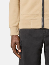 Sweatshirt in organic cotton fleece with a contour drawstring hood, hand pockets, overlock stitches, lunette detail, and zipper fastening. Garment dyed. FABRIC RESEARCH AND TREATMENT Full-zipper hooded sweatshirt in organic cotton fleece. Garment dyed. STYLE AND FIT Hood with contour drawstring. Slanted patch hand pockets. Stone Island badge on the left sleeve. Overlock stitches on hood, shoulders, armholes, and sides. Lunette with inner lining under back neckline. Ribbed cuffs and bottom band. Zipper fastening. Regular fit. COMPOSITION AND CARE 100% Cotton