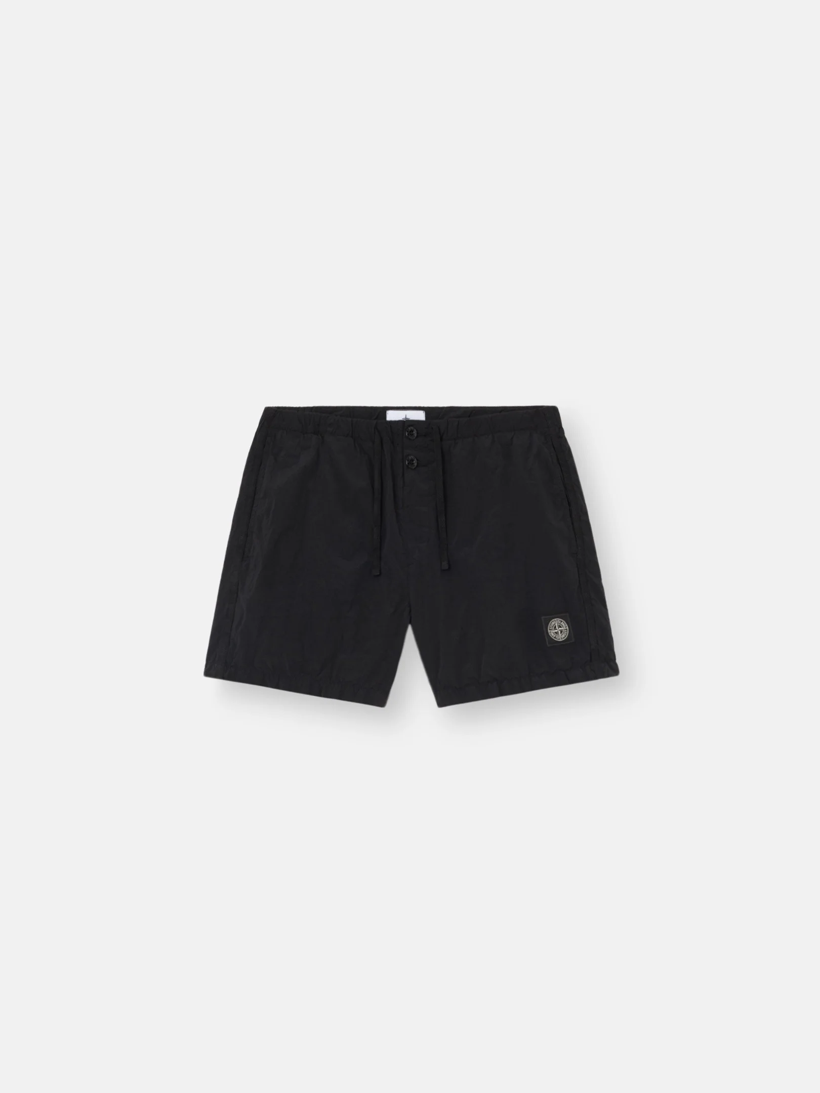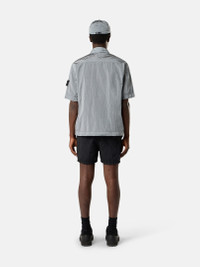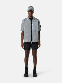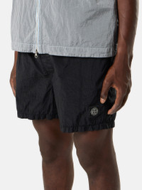 Short-length swim shorts in Nylon Metal made with ECONYL® regenerated yarns, featuring contrast stitching, side tape trim, pockets, and mesh lining. Garment dyed. FABRIC RESEARCH AND TREATMENT Short-length swim shorts in Nylon Metal. The evolution of this iconic material sees the use of ECONYL® regenerated yarns: the life-ended nylon, pre- and post-consumer, is recycled with a complex depolymerization process to create this fiber that features the same intrinsic characteristics of nylon from fossil raw material. Garment dyed with a double-color recipe. STYLE AND FIT All-over contrast stitching. Vertical hand pockets. Back patch pocket with concealed hook-and-loop fastening, tape tab, and eyelets. Compass logo patch on left leg. Contrasting nylon tape trim on sides. Elasticated waistband with two-button fastening and external tape drawstring. Nylon mesh lining. Slim fit. COMPOSITION AND CARE Garment: 100% Polyamide / Nylon Lining: 100% Polyamide / Nylon