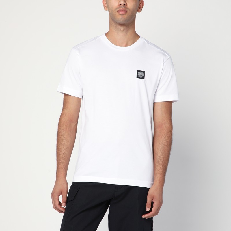 White cotton Stone Island crew-neck T-shirt, featuring short sleeves, logo patch on chest and straight hem.