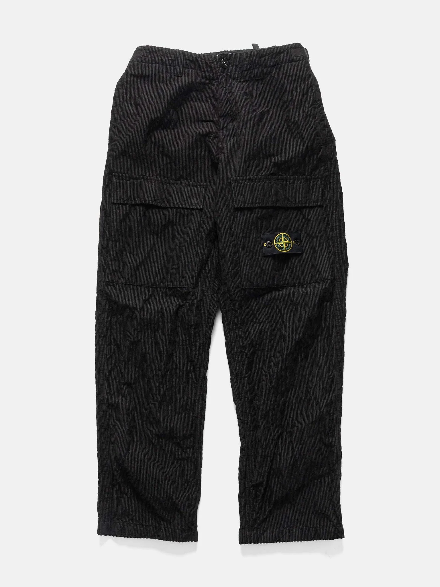The Stone Island Wrinkled Corduroy 500-TC Cargo Pants combine rugged texture with relaxed, contemporary function. Cut from a durable cotton-nylon corduroy, the fabric’s nylon monofilament weave creates a springy, wrinkled surface that’s soft yet resilient. A garment dye treatment deepens the color and enhances the fabric’s rich texture. Designed for everyday utility, they feature multiple secure cargo pockets, adjustable waistband straps, and drawcord cuffs for a customizable fit. DETAILS - 3100025 S0229 - 76% Cotton, 25% Polyamide - Garment dyed - Loose fit - Standing hand pockets - Snap closure patch back pocket - Snap and flap patch cargo pockets - Drawstring adjustable cuffs - Slide buckle side waist adjusters - Button closure and zip fly - Stone Island badge on left leg - Made in Italy