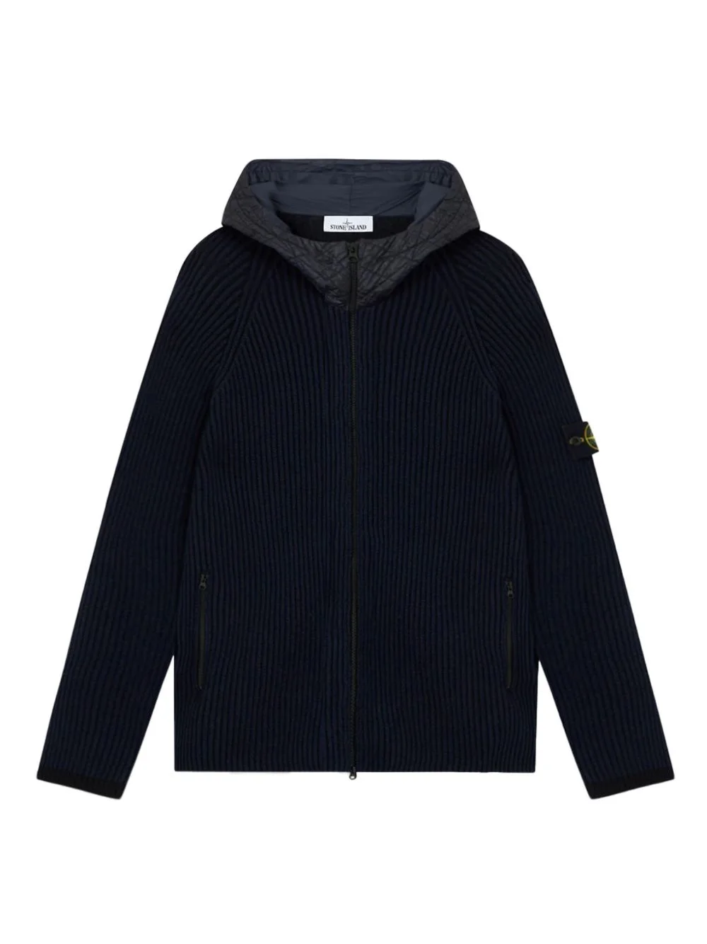 zip-up hoodie Highlights - Blue - Ribbed knit - Zip fastening - Quilted hood - Logo patch - Long sleeves Imported Composition Outer: Virgin Wool 48%, Cotton 43%, Polyamide 8%, Elastane 1% Lining: Polyamide 100%, Polyester 100%, Polyurethane Resin 100% Washing instructions Hand Wash