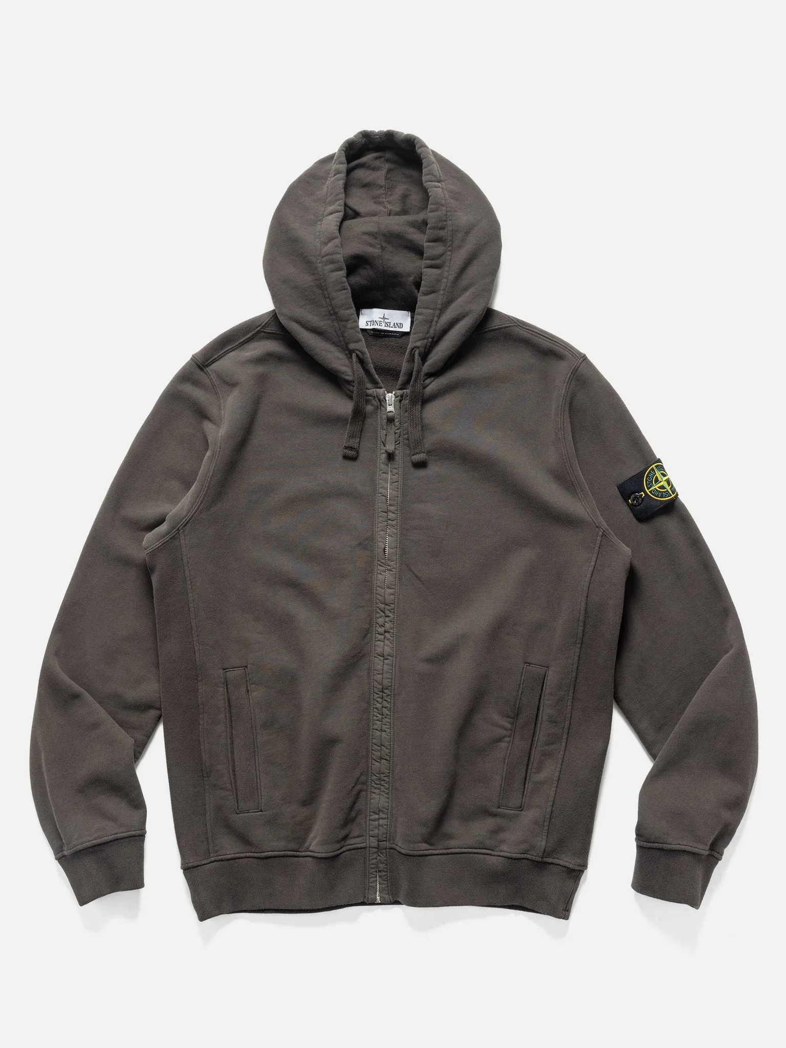 Signature zip-through hooded sweatshirt featuring iconic branded badge at left sleeve and garment dyed for a rich depth of colour and unique finish. Known for comfort and versatility, the simple hoodie is built from an exceptionally soft and durable cotton fleece. Finished with ribbed hem and cuffs, and an adjustable drawstring hood. DETAILS - 6100067 S0A20 - 100% Cotton - Regular fit - Garment dyed - Welt hand pockets - Ribbed cuffs and hem - Adjustable hood - Overstitched seams - Removable Stone Island badge at sleeve - Made in Romania