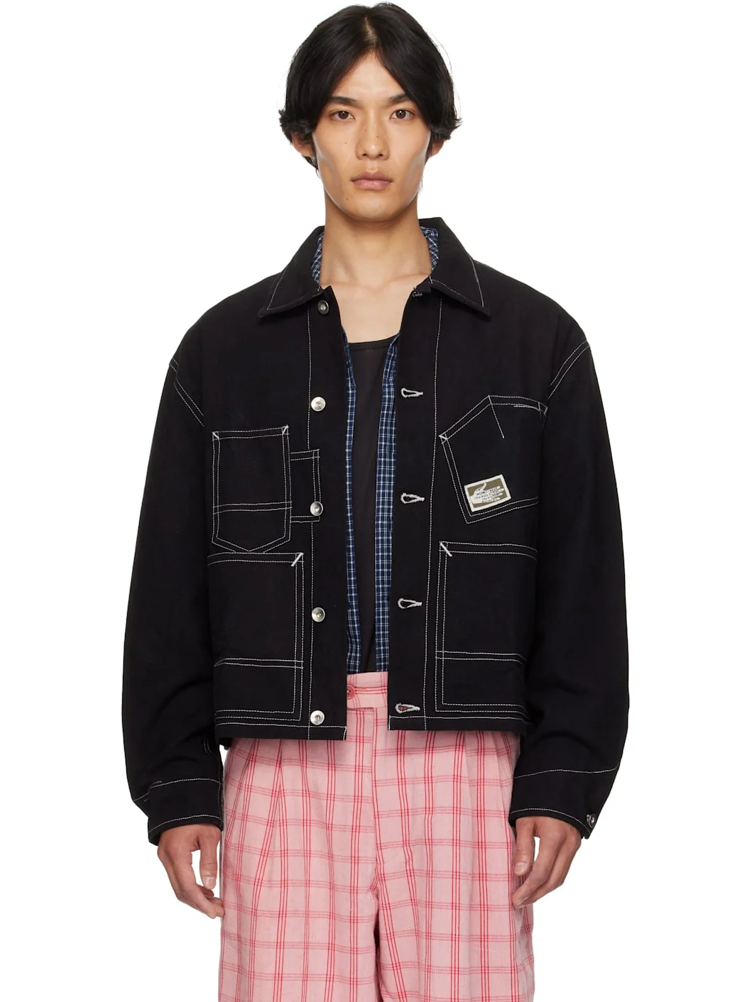Kaduka-dyed non-stretch organic cotton denim jacket. · Off-set stitching detailing throughout · Spread collar · Button closure · Logo patch at chest · Patch pockets at chest and waist · Raw-edge patch at back hem · Button barrel cuffs · Silver-tone hardware · Contrast stitching in white Part of the Wonky-Wear capsule. Supplier color: Black Wonky-Wear 100% organic cotton. Made in India 252480M180000