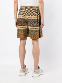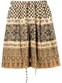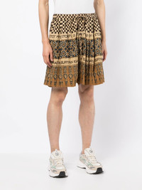 Bridge block-print Bermuda shorts Highlights - Brown - Recycled cotton - Mix print - Checkerboard print - All-over logo print - Floral print - Elasticated drawstring waistband - Concealed fly and button fastening - Two side slit pockets - Above-knee length Imported Composition Recycled Cotton 100% SIZE & FIT Model measurements Height 6 ft 2 in(1.87 m) Bust/Chest 34.25 in(87 cm) Hips 36.22 in(92 cm) Waist 29.52 in(75 cm) FittingInformation This piece fits true to size. We recommend you get your regular size Designed for a slim fit at the waist and loose over the leg Made with a mid-weight fabric