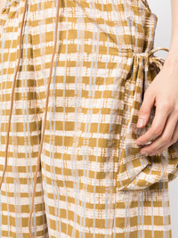 check-print wide-leg trousers Highlights - Mustard yellow - Organic cotton - Check print - Elasticated drawstring waistband - Front button fastening - Wide leg - Two side pouch pockets - Rear flap pocket - Straight hem - When buying this unisex item, keep in mind that it is graded in standard men's sizing. Imported Composition Body: Organic Cotton 100% SIZE & FIT Model measurements Height 6 ft 2 in(1.87 m) Bust/Chest 34.25 in(87 cm) Hips 36.22 in(92 cm) Waist 29.52 in(75 cm) FittingInformation This piece is unisex and is designed with a wide-leg, whether you usually select women's or men's sizes Adjust this piece’s waistband to your preference using the drawstring Made from a midweight non-stretch fabric