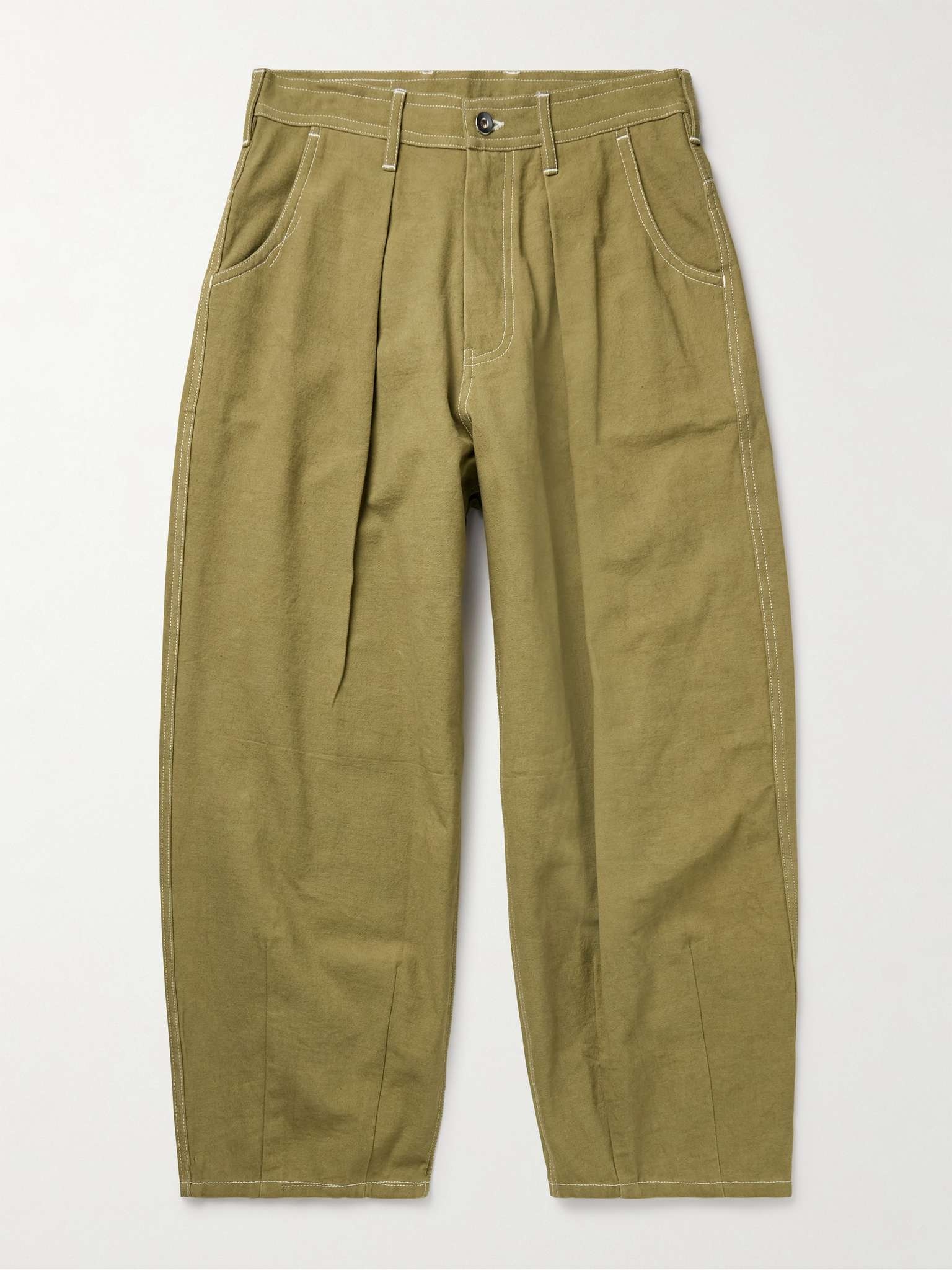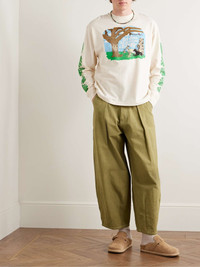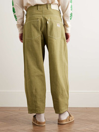 Story Mfg.'s 'Lush' trousers are reminiscent of vintage workwear. Pleated to enhance the wide, barrel-leg fit, they're cut from organic cotton-canvas and detailed with a distressed patch along the waistband and signature 'Wonky-Wear' logo at the back pocket. Lower Impact Materials. This product is made using at least 50% lower-impact materials or ingredients. Find out more about our Consciously Crafted criteria here. Size & Fit - Fits true to size. Take your normal size - Wide leg, low-crotch style - Mid-weight, non-stretchy fabric - Model is shown wearing a M - Model measures: waist size 32, height 6'2"/ 188cm Details & Care - Army-green organic cotton-canvas - Button and zip fastening - 100% organic cotton - Machine wash