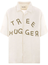 Greetings applique-lettering shirt Highlights - Ecru - Cotton-linen blend - Crochet applique lettering - Front button fastening - Short sleeves - Straight hem - Classic collar Imported Composition Cotton 55%, Linen/Flax 45%
