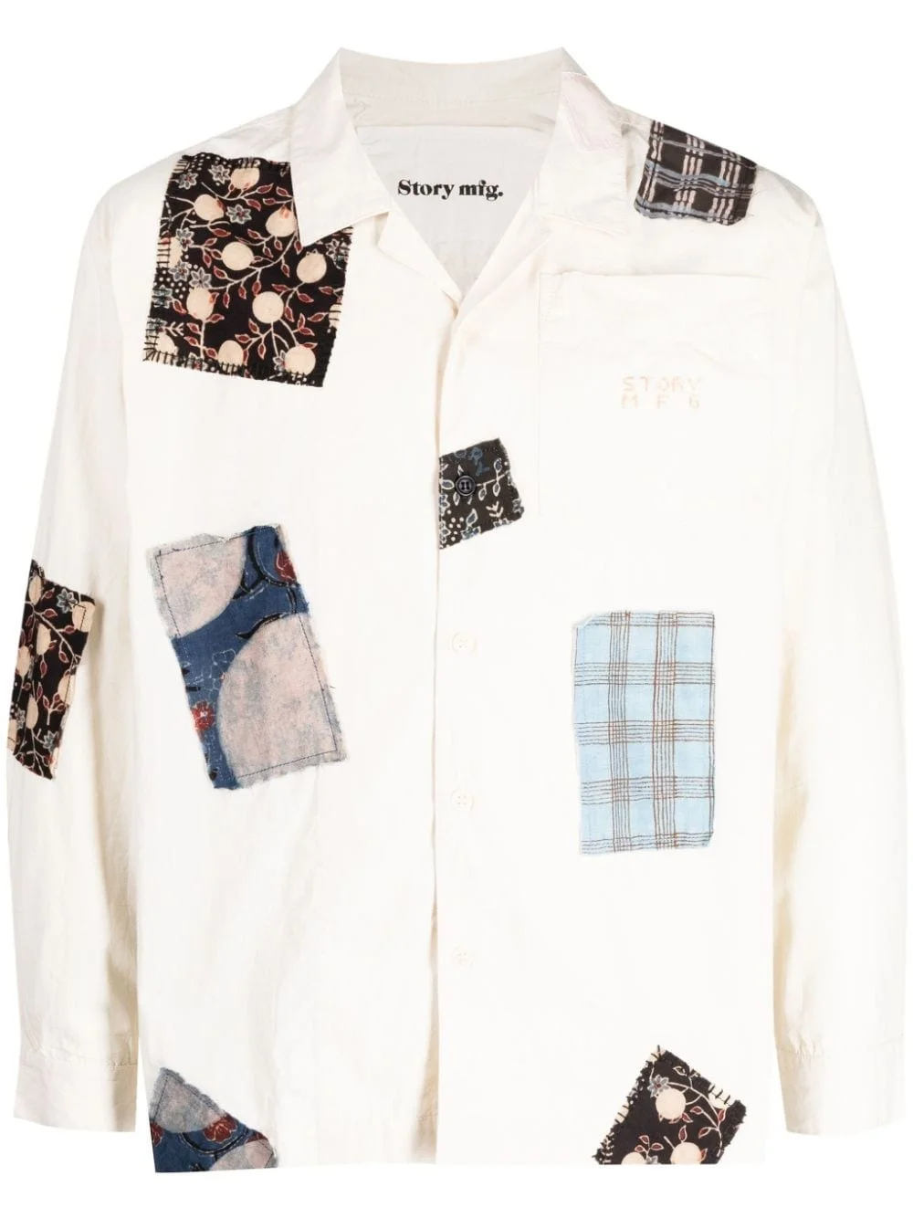 Greetings patchwork cotton shirt Highlights - Ecru/multicolour - Organic cotton - Patchwork detailing - Embroidered logo at the chest - Spread collar - Front button fastening - Long sleeves - Buttoned cuffs - Straight hem Imported Composition Body: Organic Cotton 100% SIZE & FIT Model measurements Height 6 ft 2 in(1.87 m) Bust/Chest 31.49 in(80 cm) Hips 37.79 in(96 cm) Waist 27.95 in(71 cm) Measurement CHEST 42.51 in(108 cm) SLEEVE LENGTH 22.04 in(56 cm) Shoulder Width 18.11 in(46 cm) LENGTH 25.59 in(65 cm) WAIST 42.51 in(108 cm) FittingInformation Designed to be unstructured, offering a loose fit throughout Made from a midweight non-stretch fabric This piece fits true to size – take your usual size