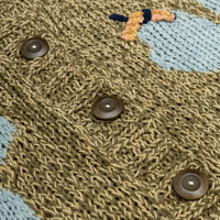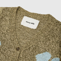 - SSS25KNITWCHANOLK-OLV - Twisted Olive Luck - 100% Organic Cotton - Naturally hand dyed with Iron, Kaduka, Natural Indigo, Padhimugam, Palapattai, and Sevilokodi - Front button closure - Intarsia knit with crochet applique - Ribbed y-neck, cuffs, and hem - Loose fit - Story mfg. products are handmade and often unique due to the natural dying process - Recommended to hand wash due to natural dyes in garments. Otherwise, wash cold and air dry. It is not recommended to dry clean these garments