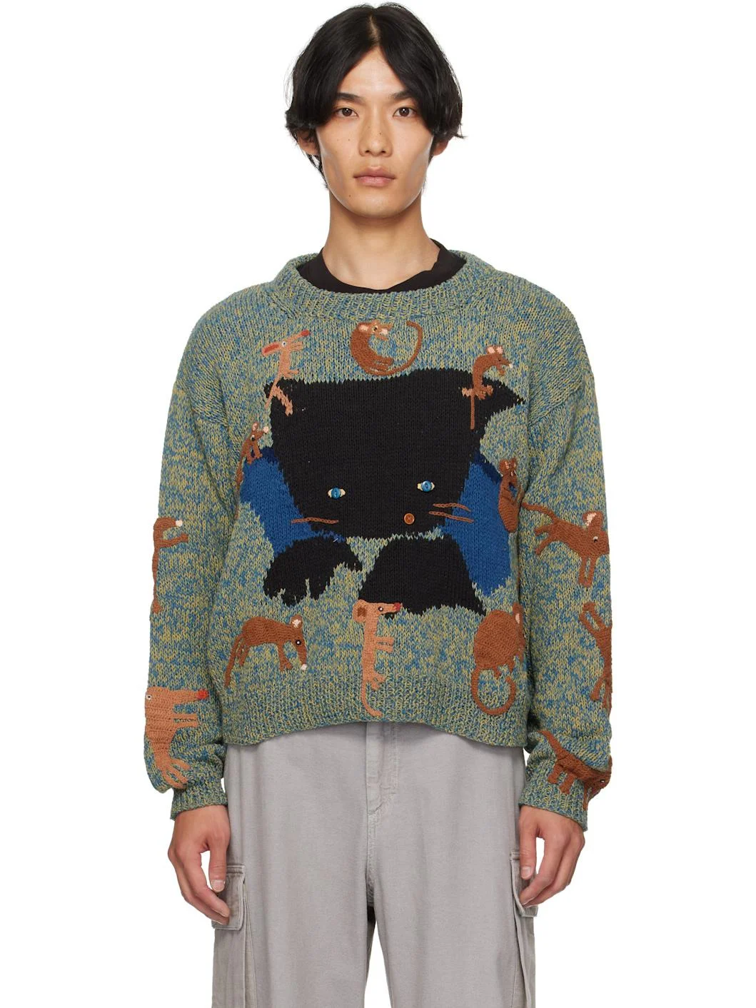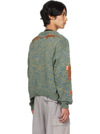 Knit organic cotton sweater. Dyed with natural indigo, pomegranate, palapattai and karuvelam pattai bark, and sevilokodi flower. · Rib-knit crewneck, hem, and cuffs · Intarsia graphics at front · Hand-crocheted graphics at front and back · Dropped shoulders Supplier color: Green Friends 100% organic cotton. Made in India 252480M201001
