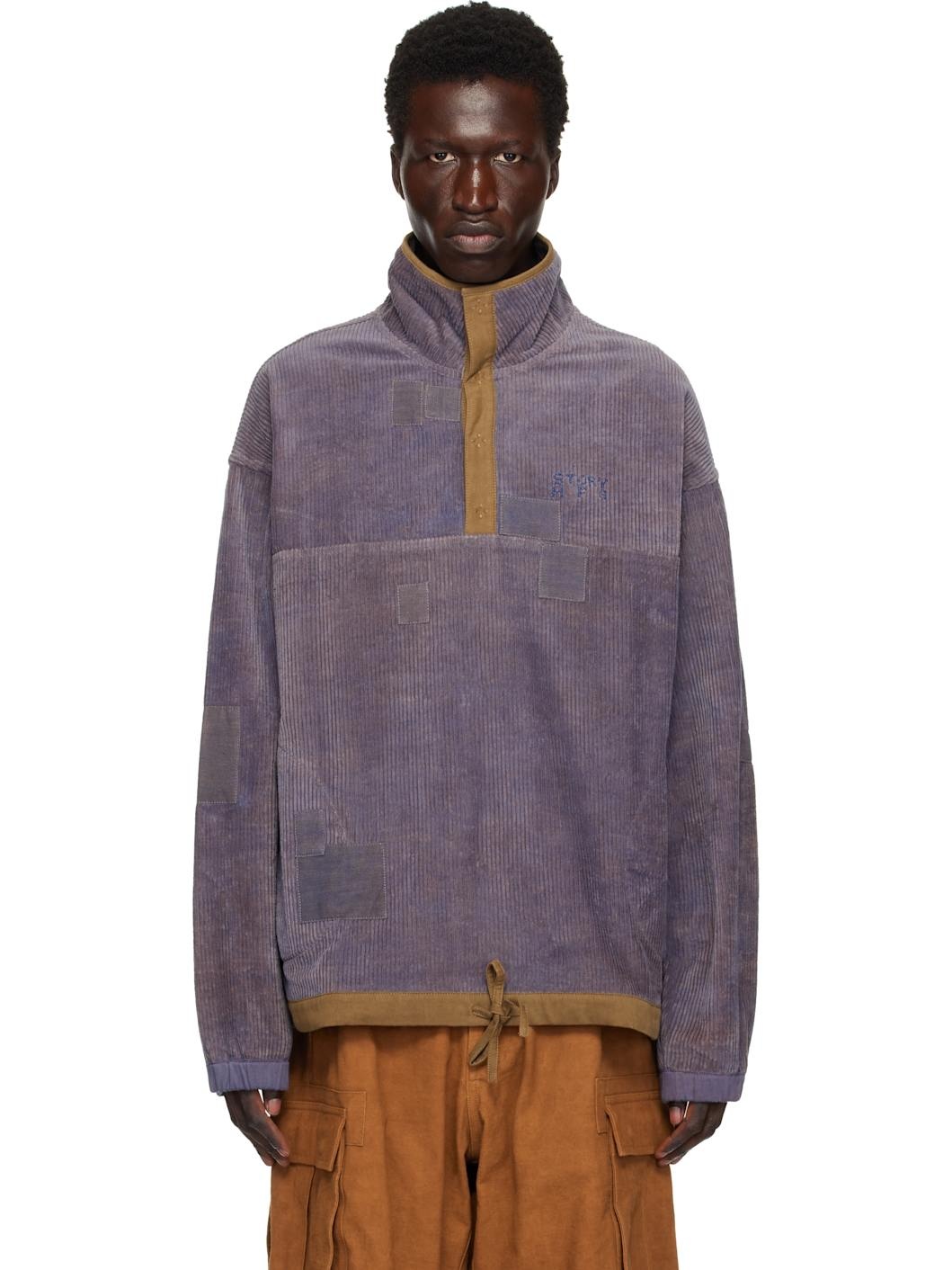Handcrafted indigo-dyed organic cotton corduroy sweatshirt. Patchwork detailing throughout. · Oversized · Spread collar · Press-stud placket · Hand-embroidered logo at chest · Seam pockets · Drawstring at hem · Dropped shoulders · Elasticized cuffs Supplier color: Purple scarecrow cord