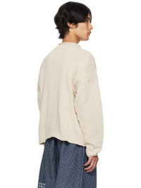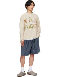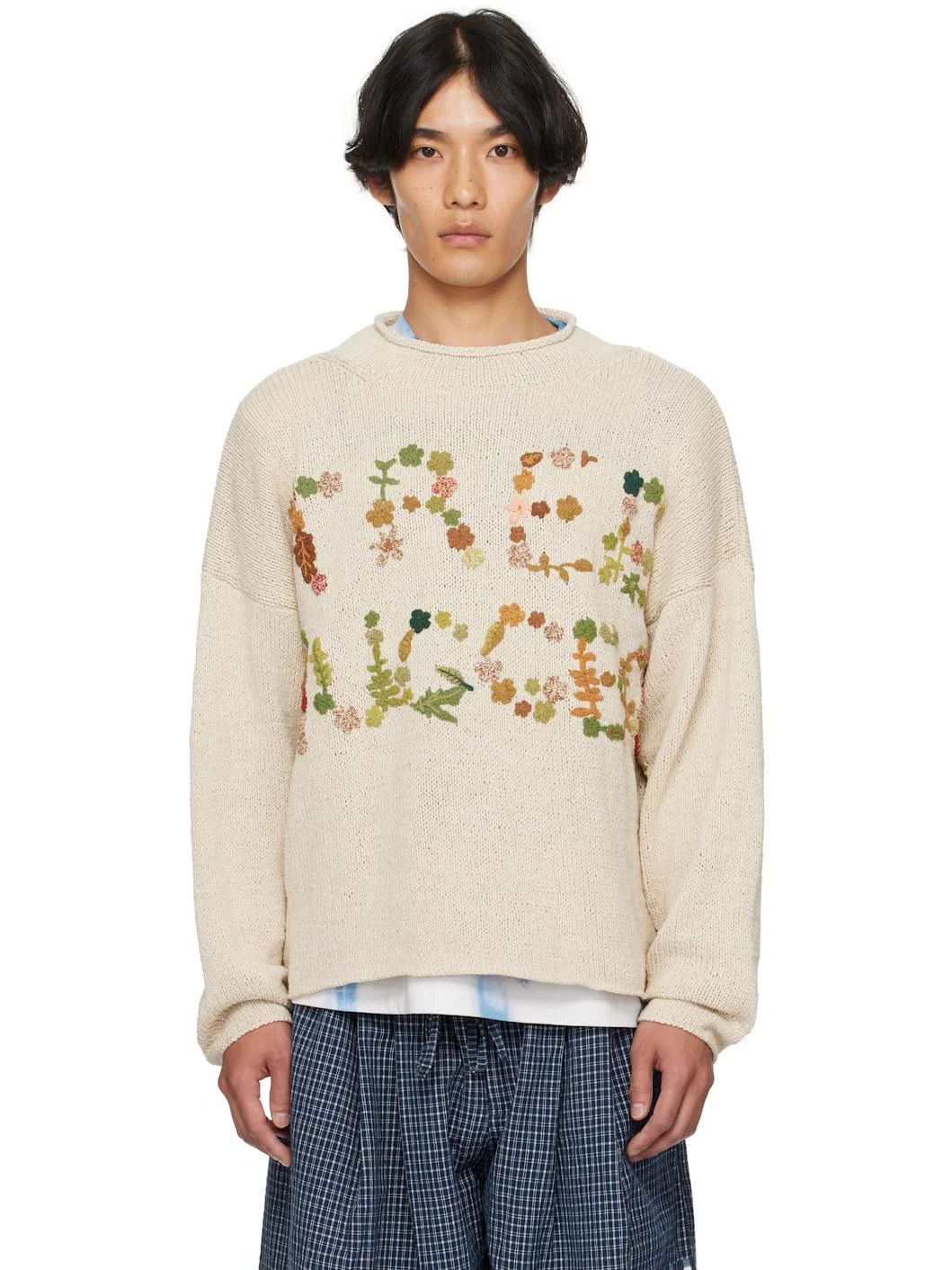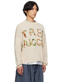 Hand-knit organic cotton sweater. Dyed with natural indigo, pomegranate, kaduka, karuvelam pattai bark, and sevilokodi flower. · Rolled edge at crewneck · Hand crocheted floral text at front · Dropped shoulders Supplier color: Ecru Tree Hugger 100% organic cotton. Made in India 252480M201000