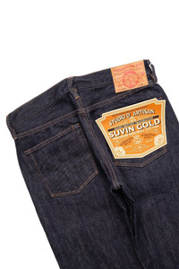 This denim is made as a finer alternative to Studio D'Artisan's flagship 15oz selvedge denim, and is woven with Suvin Gold cotton, the world's finest super-long staple cotton. Suvin Gold has the thinnest and longest fibers of any cotton, which gives it an incredibly soft hand combined with the natural oils in the yarns, granting an incredibly soft hand, silky luster, and organic texture. SDA takes these Suvin Gold threads and twists them together to create double threads, which are then used for the warp. The weft (underside) of the fabric incorporates American Supima cotton, another super-long staple cotton that offers significant durability. Woven together into a selvedge denim using vintage power looms in Okayama, this fabric offers the softest hand of any D'Artisan denim, and should fade beautifully with wear, with this fabric being known for producing unique vertical fade streaks. Since D1837 is an alternative to SD-108 that incorporates super-long staple Suvin Gold cotton instead of SDA's usual 15oz denim, it features D'Artisan's "08" relaxed tapered fit. One of our most successful fits, SDA's relaxed taper features a high rise, roomy hip and thigh, and a taper from the lower thigh to the leg opening. Perfect for guys who dislike a loose leg opening but either require or desire a loose top block, this is our most successful SDA cut, and fits most everyone quite well. With a leg opening that is just wide enough to look great with boots, this is an ideal cut for those of you who like a taper. These jeans feature branded enamel buttons and branded rivets, a deerskin leather patch, and a redline selvedge ID. - 100% cotton - D1837S - 15oz Suvin Gold Japanese selvedge denim - Suvin Gold fine super-long staple yarns - Woven on vintage shuttle looms - Redline selvedge ID - SDA enamel buttons - SDA branded rivets - SDA deerskin leather patch - Relaxed tapered fit - Made in Okayama, Japan