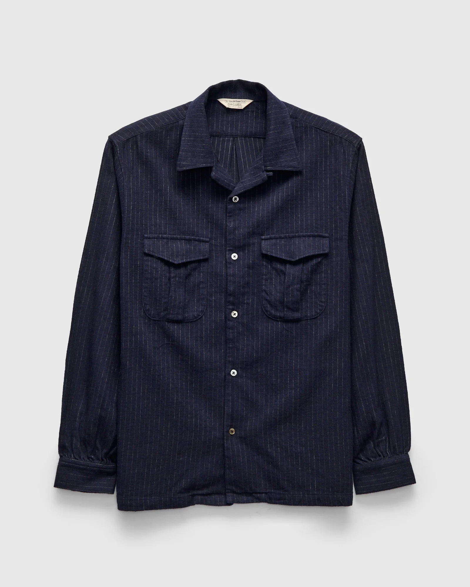 Orgueil is an offshoot label of Studio D’Artisan referencing early 1900s French and American workwear. Receiving inspiration from 1930s gentleman's attire, this shirt features a custom cotton-linen-wool fabric. Crafted with an open camp collar, gusseted chest pockets, and mother of pearl buttons. - Regular fit - Striped linen-wool blend fabric - Gusseted chest pockets - Mother of pearl buttons - 57% cotton 29% linen 14% wool - Made in Japan