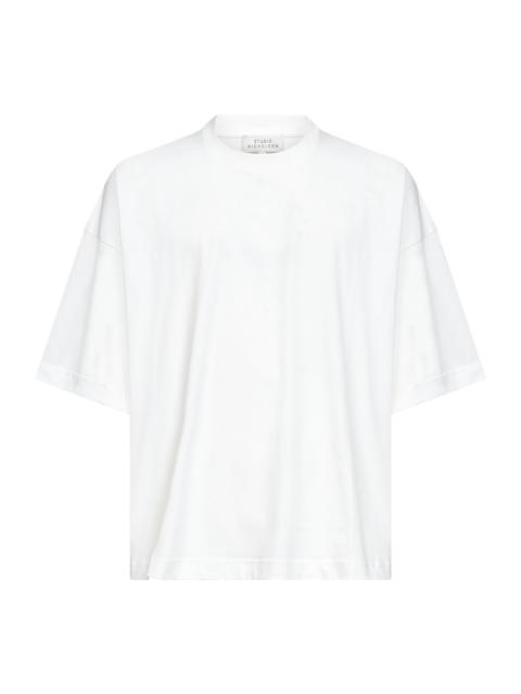 - Ribbed crewneck - Elongated short sleeves, dropped shoulders - Tone-on-tone screen printed branding at nape - Straight hem - Midweight cotton jersey design - Oversized voluminous fit - Blue color - 100% cotton - Made in portugal Natural (Veg): Cotton100 % Made in: Portogallo Season: A25 PIUSNMMIDWEIGHTJERSEYDARKESTNAVY