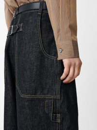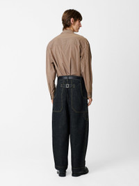 Applying tailoring details to utilitarian, carpenter-style jeans, the Bridges draw on numerous sources of inspiration. With a very full cut, they have deep pleats and a curved leg shape. This iteration is cut from a rigid 13oz Italian denim with a strong salt and pepper grain and tobacco thread at the seams. The fabric will soften and lighten in colour with age. DETAILS - Oversized fit - 13oz Italian denim - Zip fly with button closure - Front pleats - Back cinch - Wide cuffTheo is 6'2" / 188 cms and wears a Medium CARE 100% Cotton Wash at 30°C | Warm Iron