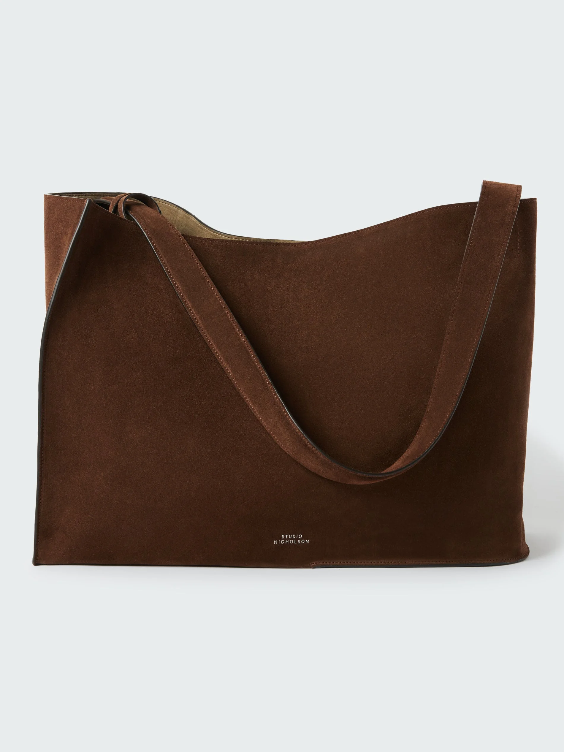 Combining perpendicular lines with the curved, this extra-large tote is constructed from Italian leather with just two corner seams and one shoulder strap, creating volume and a silhouette reminiscent of an unstructured shoulder or sleeve. The fixed strap is secured on opposite corners permitting the bag to slouch when worn. This tote fits comfortably under the arm falling to the wearer's fingertips. DETAILS - Includes detachable zipped pochette - 100% suede - Made in Italy - Microfiber lining - W: 440mm x H: 320mm x D: 185 mm - Handle depth: 290mm