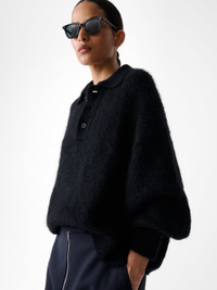 A contemporary reimagining of the enduring polo silhouette, the Dune jumper is rooted in our fabric-first philosophy. It’s expertly knitted with superkid mohair – a luxurious, high-quality yarn made from the hair of young goats and selected for its warmth and silky, super-soft hand feel. Ideal for layering, Dune is constructed to a cropped silhouette with a three-button placket and chunky ribbed trims. DETAILS - Polo collar - Three-button collar - Cropped silhouette - Ribbed trimsTheodor is 6'2" / 188 cms and wears a MediumLuana is 5'10" / 178 cms and wears a Small CARE 50% Recycled Polyamide 46% Superkid Mohair 4% WOOL Hand Wash & Dry Flat | Dry Clean