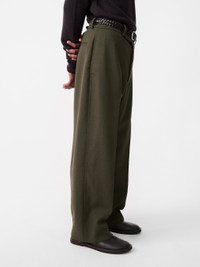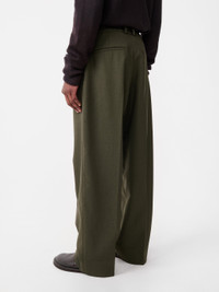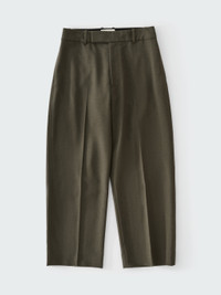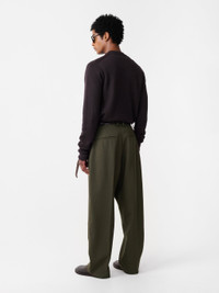 An unassuming wardrobe staple, these Ester pants are cut from an Italian-miled grain de poudre – a fabric made from combed wool yarns and noted for its matte finish and dry, technical hand feel that recalls classic tailoring cloth. They’re tailored to a straight-leg profile with an extended waist tab, then finished with front and back pressed creases. DETAILS - Extended waist tab, zip-fly and hook-and-bar closure - Side slip pockets - Two rear welt pockets - Front and back pressed creases Darron is 6'1" / 185 cms and wears a size Medium CARE Main: 88% Wool 12% Polyamide Lining: 51% Viscose 49% Cotton Hand Wash | Delicate Dry Clean Made in Portugal