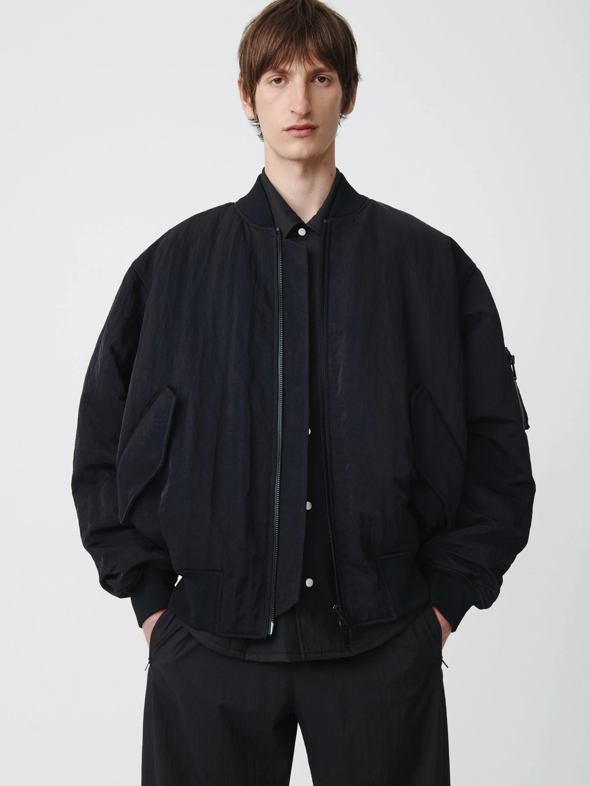 The iconic bomber jacket is reimagined in a sporty, modern fabric. Leroy is lightly padded, with a shell cut from textured showerproof nylon, and an oversized, blouson-style silhouette. - Two-way zip - Ribbed collar, cuffs, and hem - Relaxed shape - Crisp, compact nylon Theodor is 6' 2" / 188cm and wears a size M DETAILS & CARE 100% Nylon Filling: 100% Recycled Polyester Lining: 95% Polyester, 5% Spandex Professional Wet Clean