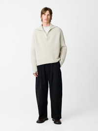 Our latest module presents pared-back takes on sporty Americana silhouettes, and the boxy Nash knit offers a modern interpretation of the classic polo shape. It’s knitted from dry twisted Merino lambswool in a dense 5-gauge rib, imbuing it with a natural elasticity and a soft, bouncy hand feel. Note how the ribbed cuffs are interrupted by practical thumbholes for a cosy quality. DETAILS - Boxy fit - Polo collar - Dropped shoulder - Ribbed thumbhole cuffs - Ribbed straight hemTheodor is 6'2" / 188 cms and wears a Medium CARE 100% RWS Extrafine Merino Wool Hand Wash | Dry Flat