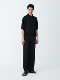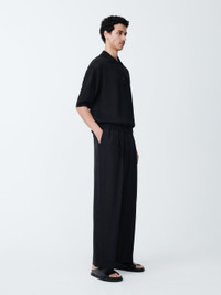 Our Noam Pant is a trouser that hits the difficult spot between casual and formal. Its loose, slouchy fit is contrasted by more formal detailing, like sharp front pleats and welted rear pockets, meaning it can be worn casually, or with the matching Daburu Jakcet for a soft tailoring approach to summer weddings. - Mid-rise, slouchy fit - Wide leg - Elasticated, drawstring waist - Front pleatsNazim is 6'3" / 190cm and wears a size M DETAILS & CARE 76% Viscose 24% Virgin Wool Dry Clean Only Made in Portugal