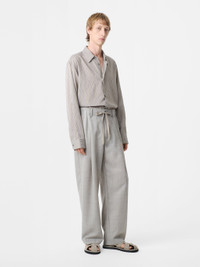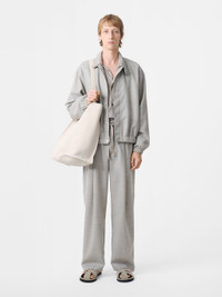 Our Noam Pant is a trouser that hits the difficult spot between casual and formal. Its loose, slouchy fit is contrasted by more formal detailing, like sharp front pleats and welted rear pockets, meaning it can be worn casually, or with the matching Harle Jacket for a contemporary approach to tailoring. DETAILS - Mid-rise, slouchy fit made from a tropical wool fabric - Wide leg - Elasticated, drawstring waist - Front pleats - Wear it with the matching Harle JacketJosefp is 6'2" / 187 cms and wears a Medium CARE 100% Wool Dry Clean Only Made in Portugal
