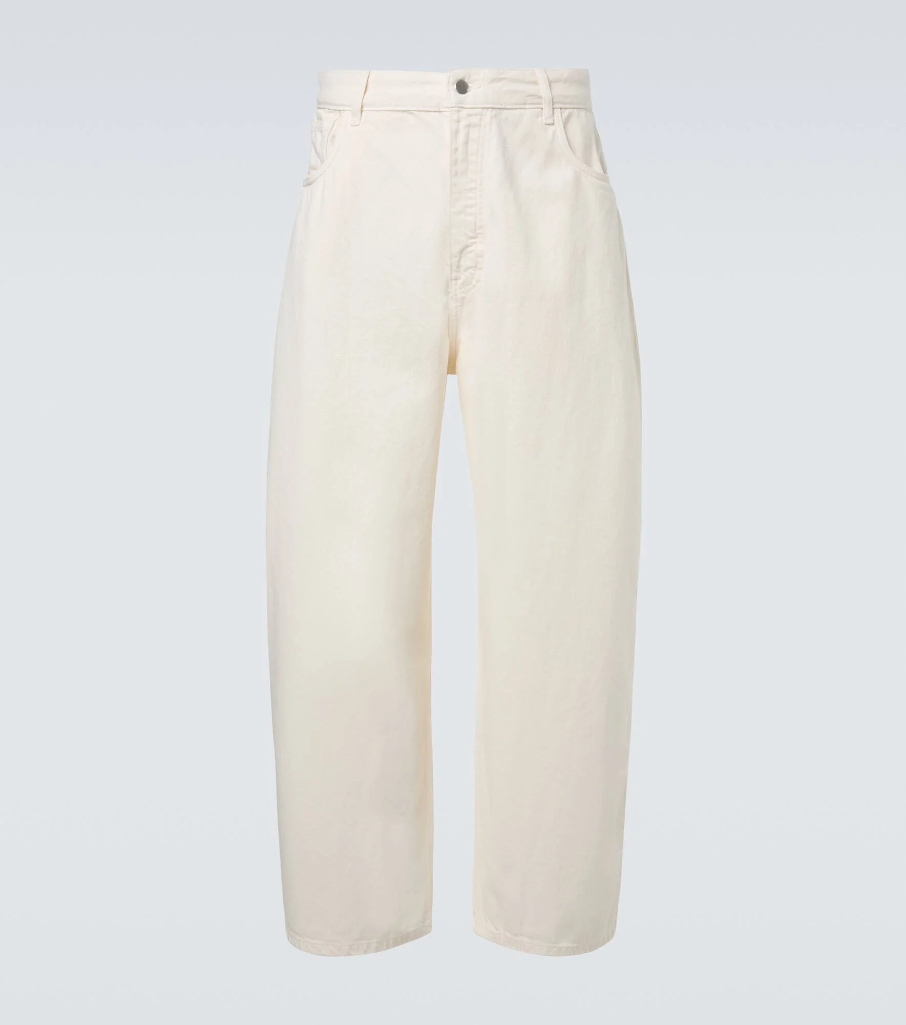 Revel in the elegance of Studio Nicholson, inspired by the balance and restraint of Japanese architecture and interiors. The Paolo jeans are cut from white denim to a wide, barrel-leg silhouette. Product Details - Material: 100% cotton - Care instructions: machine wash at 30 degrees - Made in Turkey - Color: white - Designer color name: Parchment - Pockets: five pockets - Belt loops - Closure: zip and button fastening - Item number: P01122814 Size & Fit - True to size - Non-stretchy fabric - Wide-leg - Mid-rise - The model in the picture is 185cm-6'1" and wearing a size L