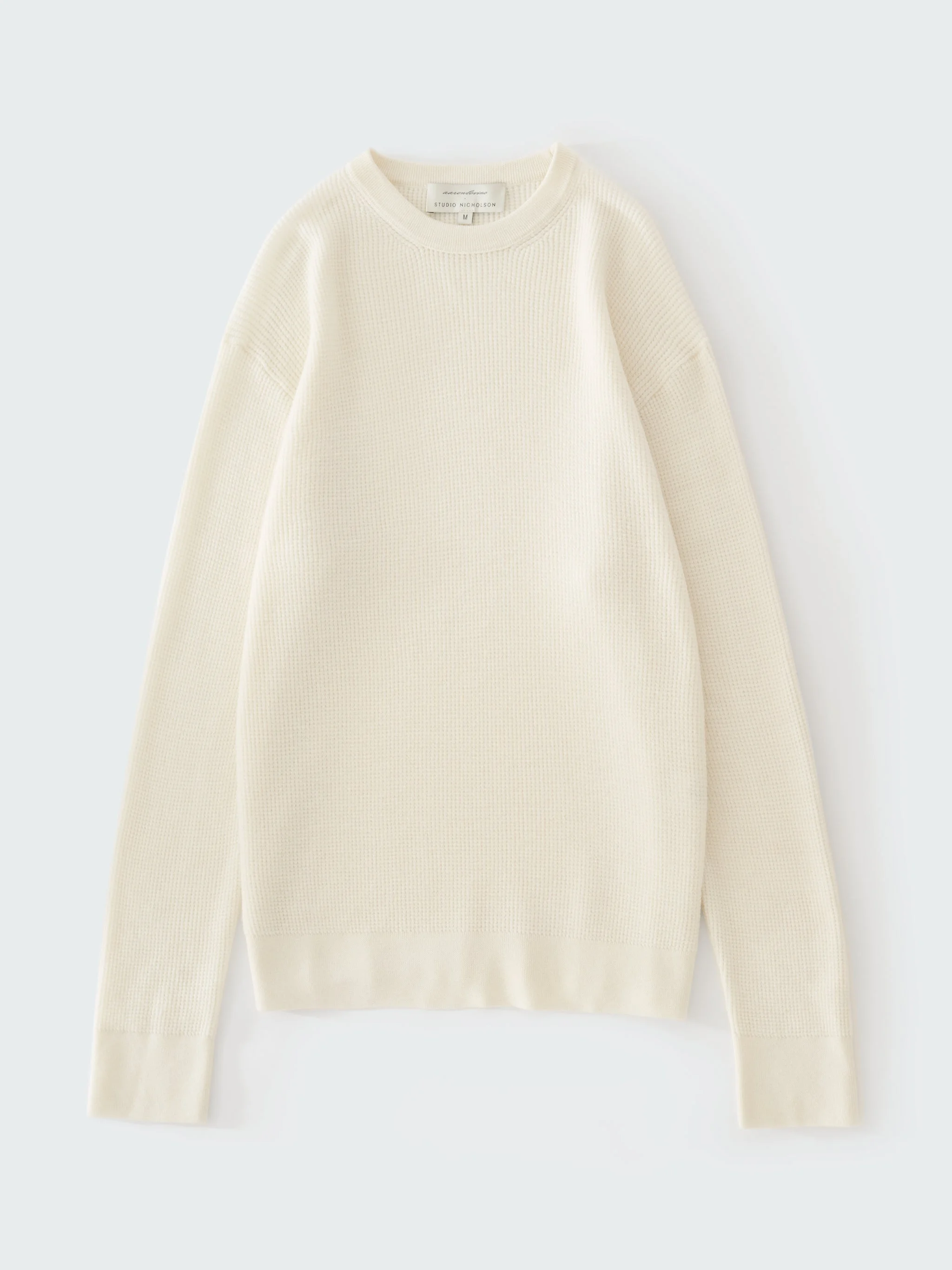 Studio Nicholson’s focus on fabrics is evidenced in the Portland jumper, an autumnal layering staple crafted in collaboration with Aaron Levine. It’s made from cashmere waffle: an Italian-milled blend of merino wool and cashmere that’s waffle-knit to create texture and insulating warmth. Portland has a classic crew neckline and dropped shoulders for a relaxed, low-key feel that’s further enhanced by the fabric choice. DETAILS - Waffle knit - Crew neck - Dropped shoulders - Ribbed trimsFinn is 6' 1½''/ 186.5 cms and wears a Medium CARE 90% Merino 10% Cashmere Hand Wash | Dry Clean Made in Italy