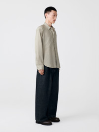 The mid-rise pants have an oversized fit with sharp single pleats for a bold, voluminous silhouette. They are made in a rigid Italian denim with a strong salt and pepper grain and tobacco thread at the seams. They are full-length with a wide cuff, designed to sit on the shoe with plenty of break. Exaggerated volume and sharp single pleats give the Puch pants a bold, dynamic visual effect. They have been constructed from a rigid Italian denim with a strong salt and pepper grain and tobacco thread at the seams. DETAILS -> CARE 100% Organic Cotton Wash at 30°C | Warm Iron