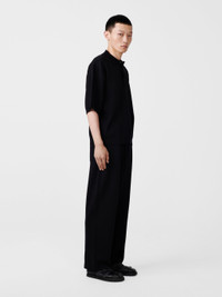Our update on the classic polo, the Rico has been knitted from our luxurious poly viscose: a dense, soft fabric that feels both sporty and refined. Oversized without being too big or long, it's already become a key part of the Studio Nicholson modular wardrobe. DETAILS - Clean design features - Soft bonded viscose fabric - Dropped shoulders - Wear it with the matching Byhr PantLi is 6'1" / 185 cms and wears a Medium CARE Outer: 84% Viscose 16% PBT Backing: 100% Polyester Hand Wash | Delicate Dry Clean Only