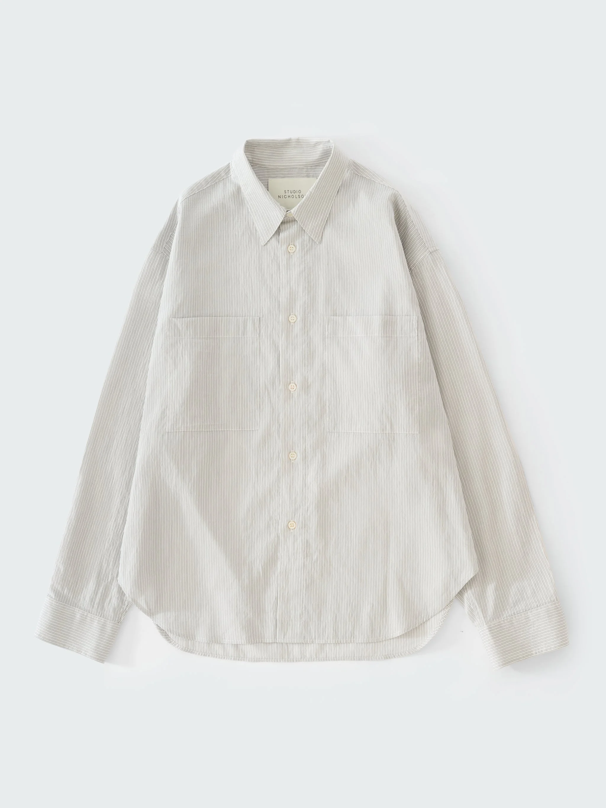 This lightweight shirt is woven in a fine, vintage-style stripe that’s exclusive to Studio Nicholson. The Salin shirt falls softly over the body with a washed, gently crinkled hand feel and features classic shirting details, including two patch pockets at the chest. DETAILS - Oversized fit - Two patch pockets on the chest - Curved hem Darron is 6'1" / 185 cms and wears a size Medium CARE 81% Lyocell 19% Polyamide Hand Wash | Delicate Dry Clean Made in Portugal