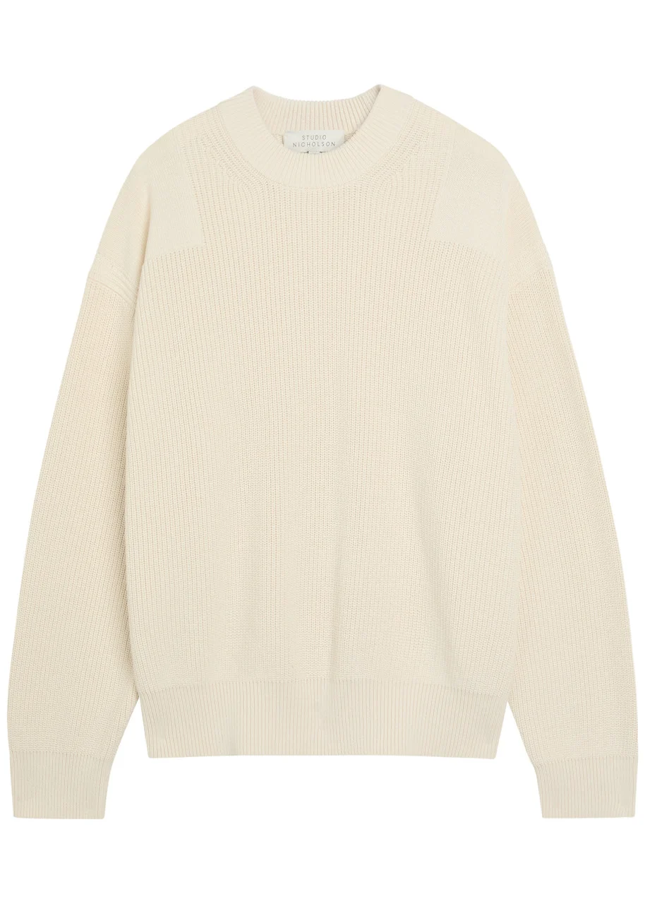 Info & Care Studio Nicholson cotton jumper Crew-neck, dropped shoulders, panelled-effect at shoulders and elbows, ribbed trims; Slips on; 100% cotton; Hand wash Size & Fit Length shoulder to hem: 25 inches/ 64cm Midweight Relaxed fit Model is 6'1"/ 185cm, chest size 38 inches and wears a size medium