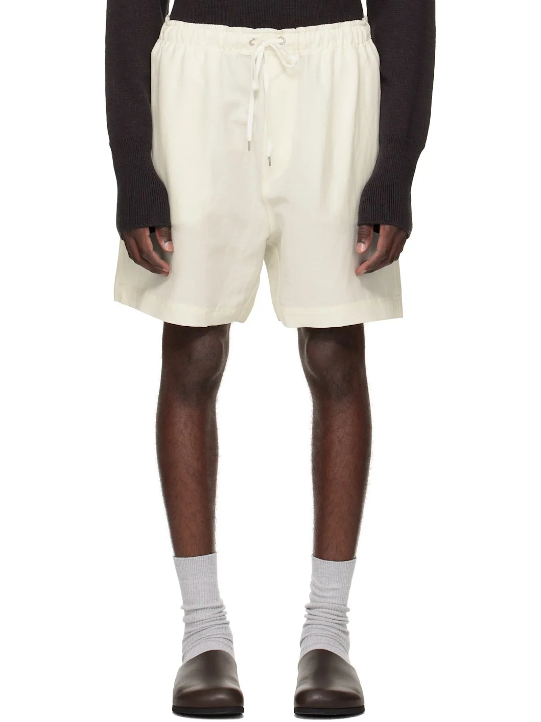 Linen- and wool-blend twill shorts. · Drawstring at elasticized waistband · Three-pocket styling · Vented cuffs Supplier color: Parchment 65% linen, 35% wool. Made in Portugal 252608M193000