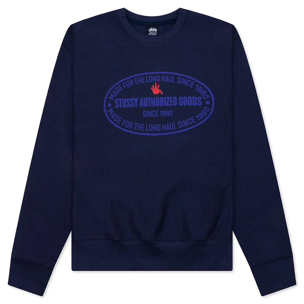 Stussy presents a new staple crewneck with the Authorized Crew. Made from cotton, this heavyweight crewneck is cut to have a relaxed fit. Classic details include ribbed trims at the neckline, cuffs, and hem. The look is complete with screen-printed graphics across the front. - 100% Cotton - Relaxed fit - Heavyweight - Crew neckline - Ribbed trims - Screen-printed graphics - Style No: 1915122-NAVY