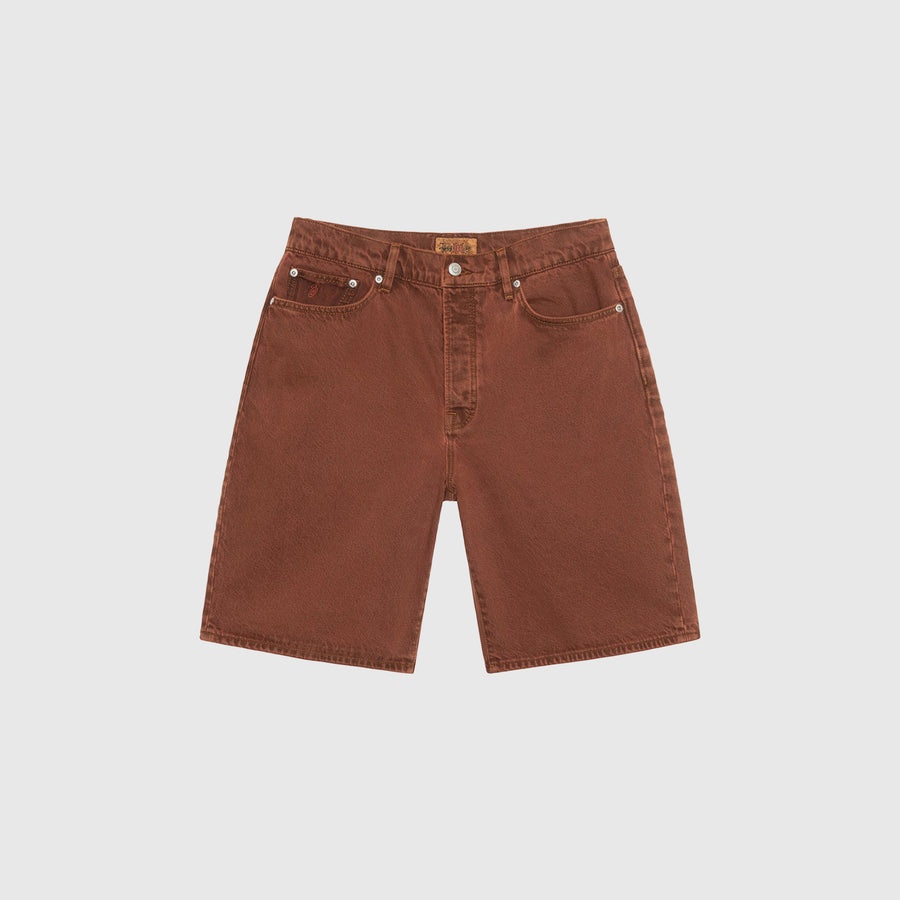 - 112296-CLAY - Clay - 100% Cotton - 14.5oz Cotton denim - Front button closure - Two side pockets with an inner coin pocket - Two back patch pockets - Embroidered swirly "S" on inner pocket - Logo patch on the back - Wide cut - Oversized fit